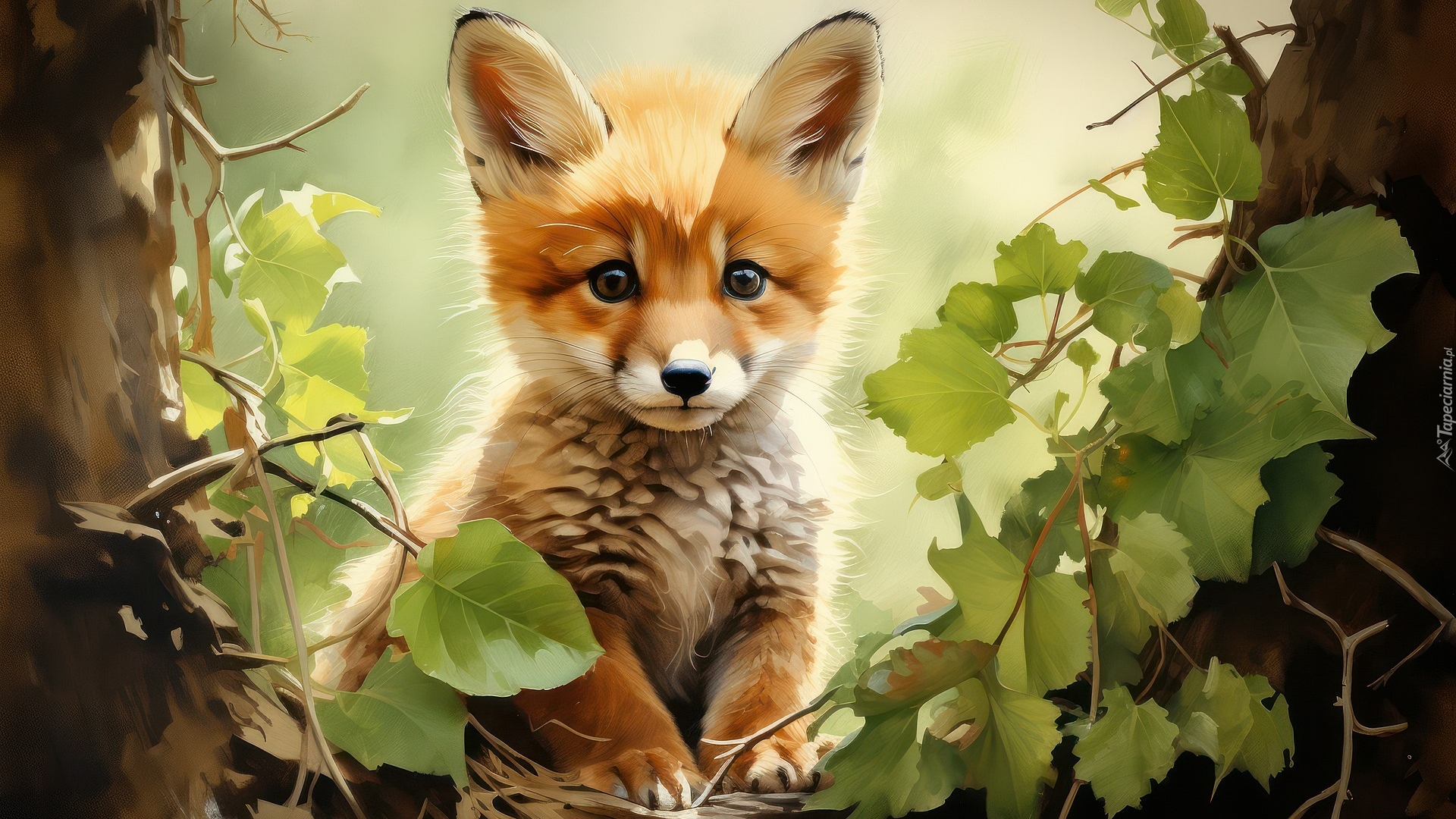 Edytor tapety: Młody lisek przy drzewach w grafice