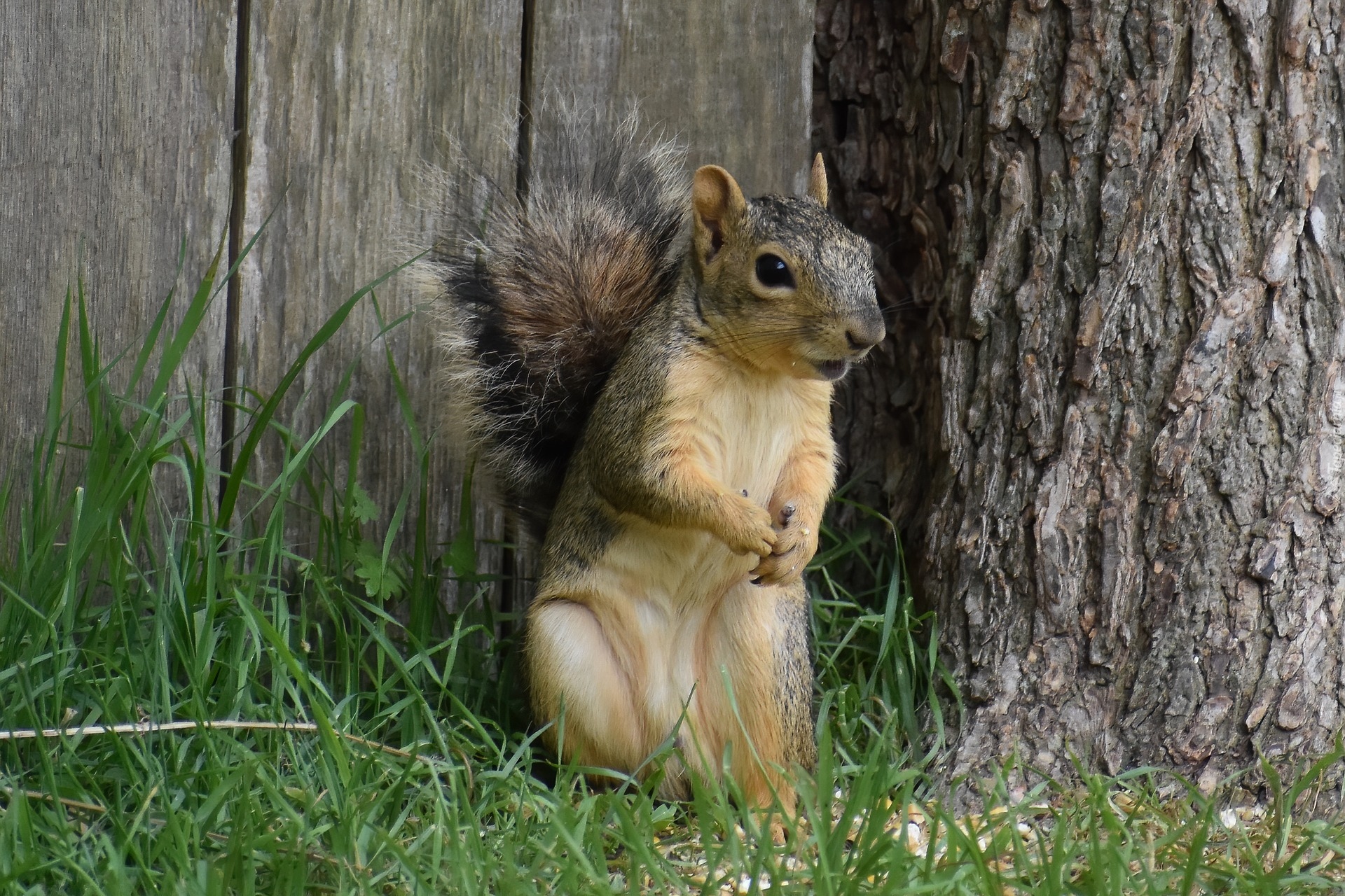 Edytor tapety: Wiewiórka stojąca obok płotu i drzewa