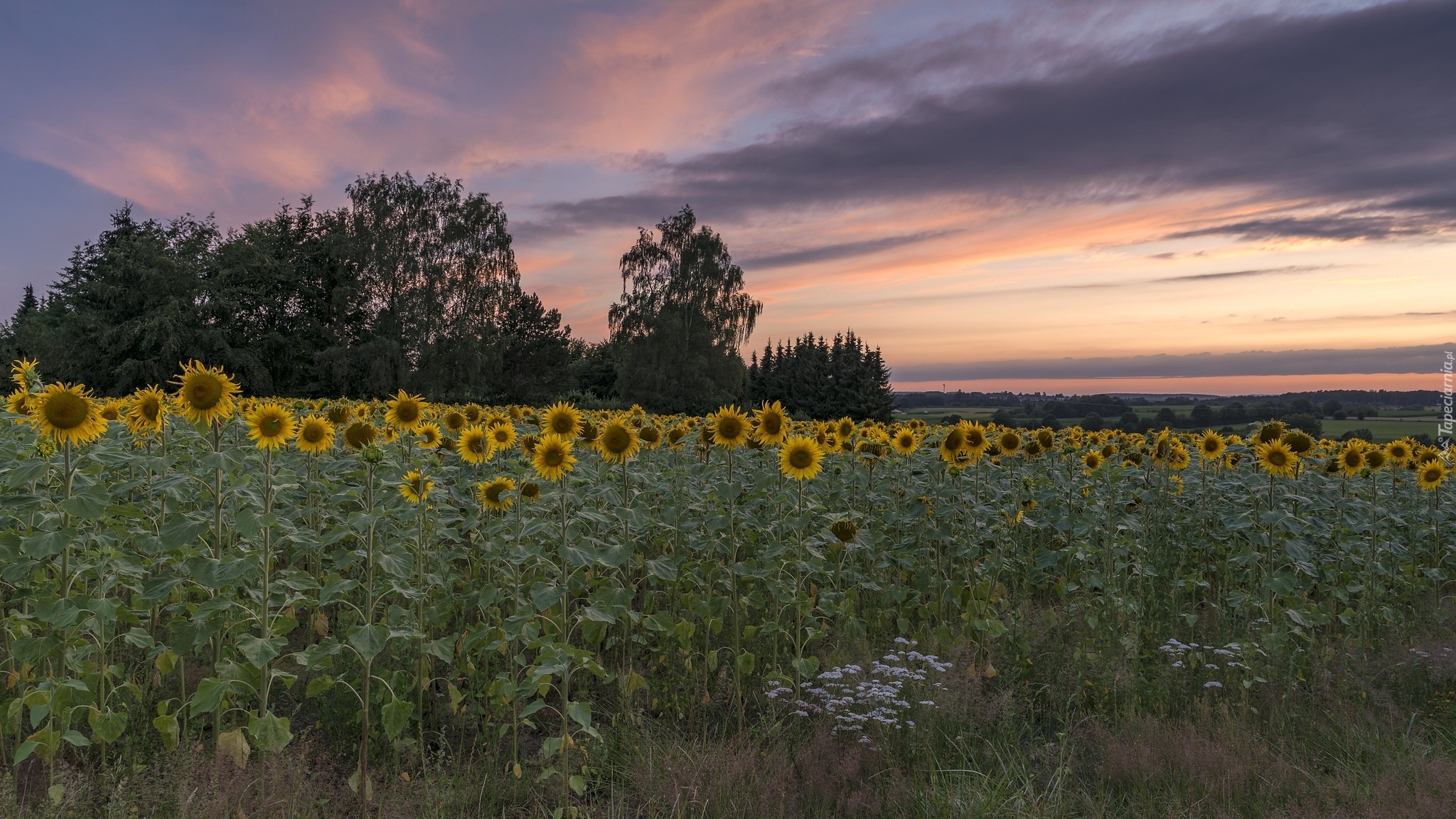 Edytor tapety: Słoneczniki na polu i drzewa o zachodzie słońca