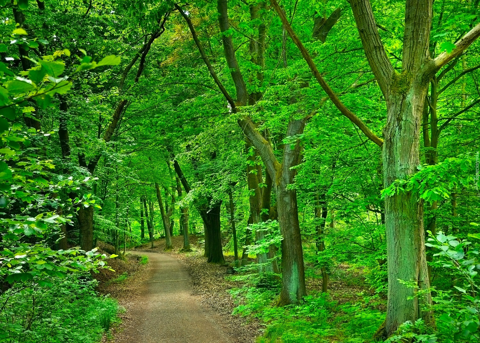 Edytor tapety: Zielone drzewa liściaste po obu stronach leśnej ścieżki