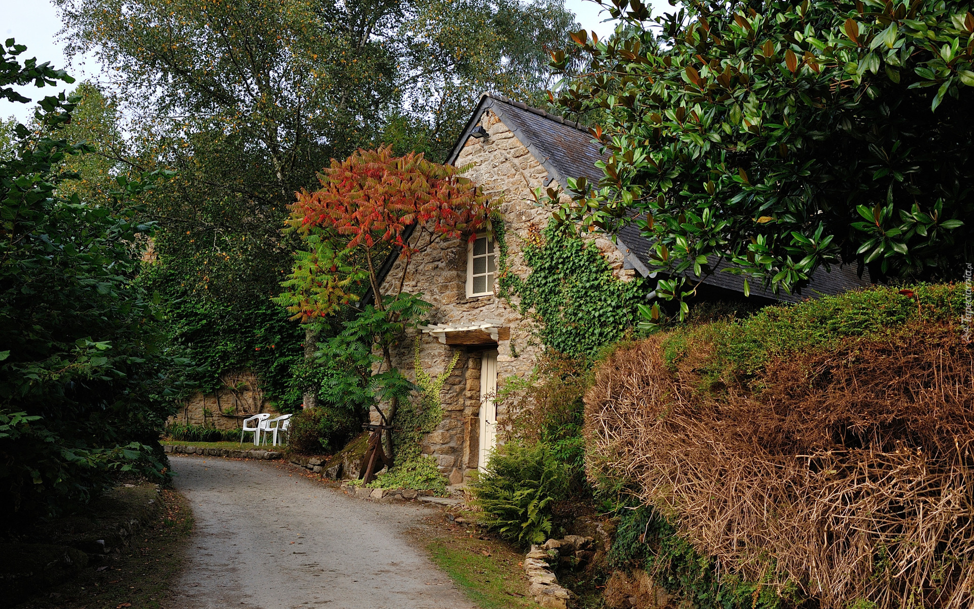 Edytor tapety: Dom z kamieni pod drzewami przy drodze