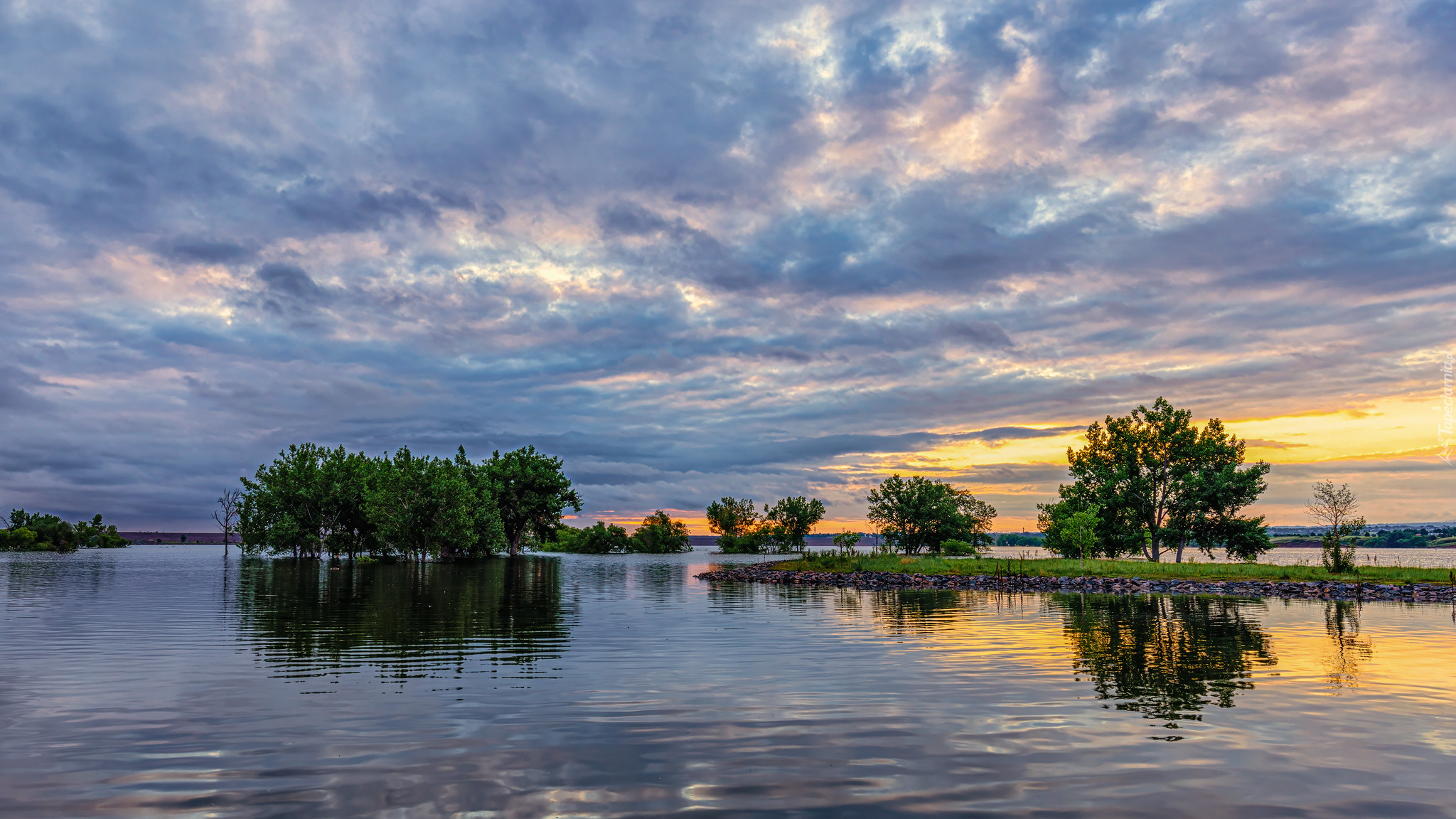 Edytor tapety: Drzewa i jezioro Chatfield Lake pod chmurami