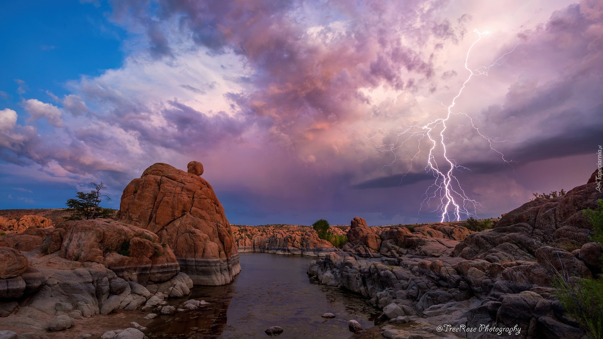 Edytor tapety: Piorun nad skałami i jeziorem Watson Lake