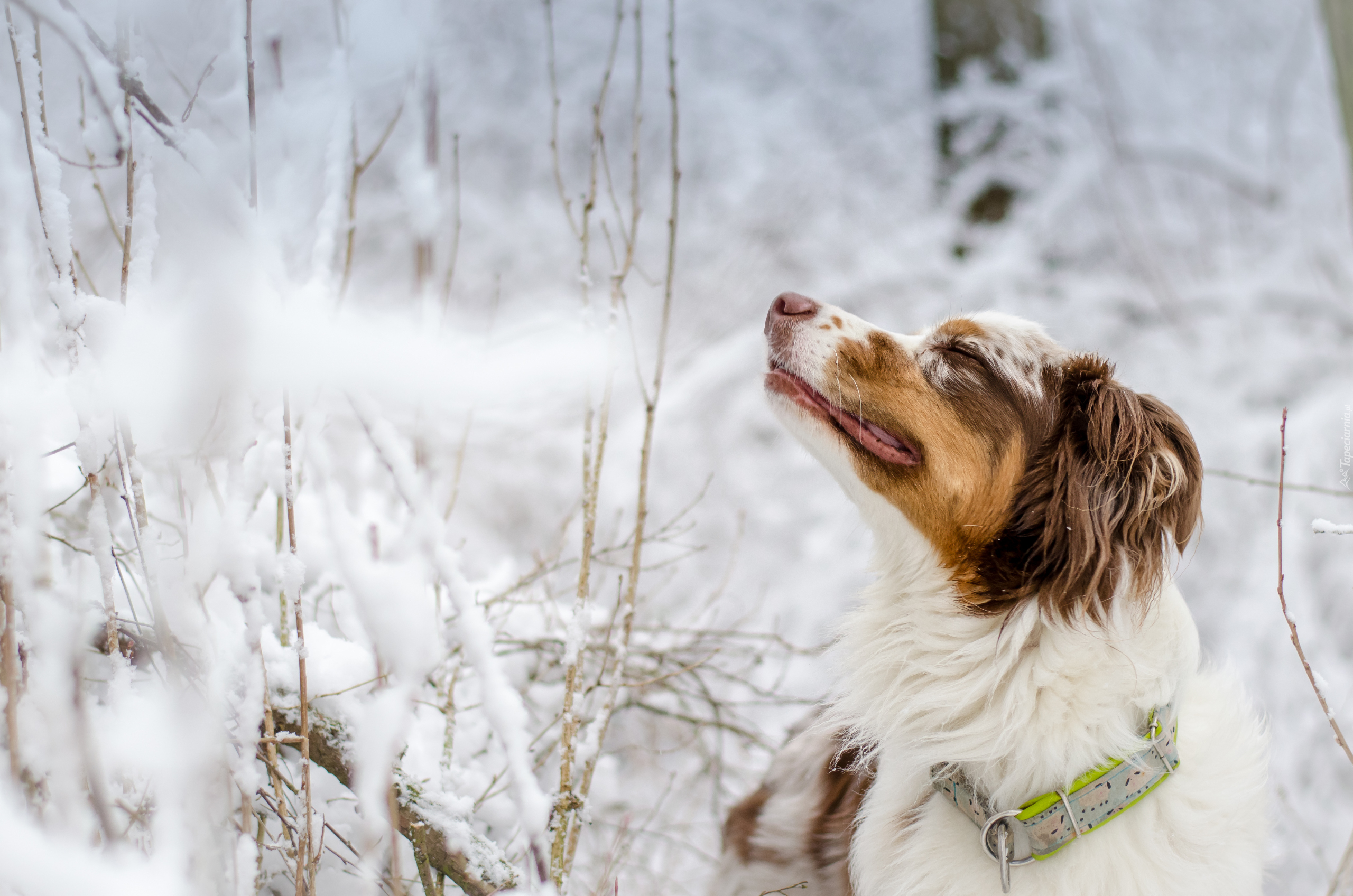 Edytor tapety: Owczarek australijski obok ośnieżonych krzewów