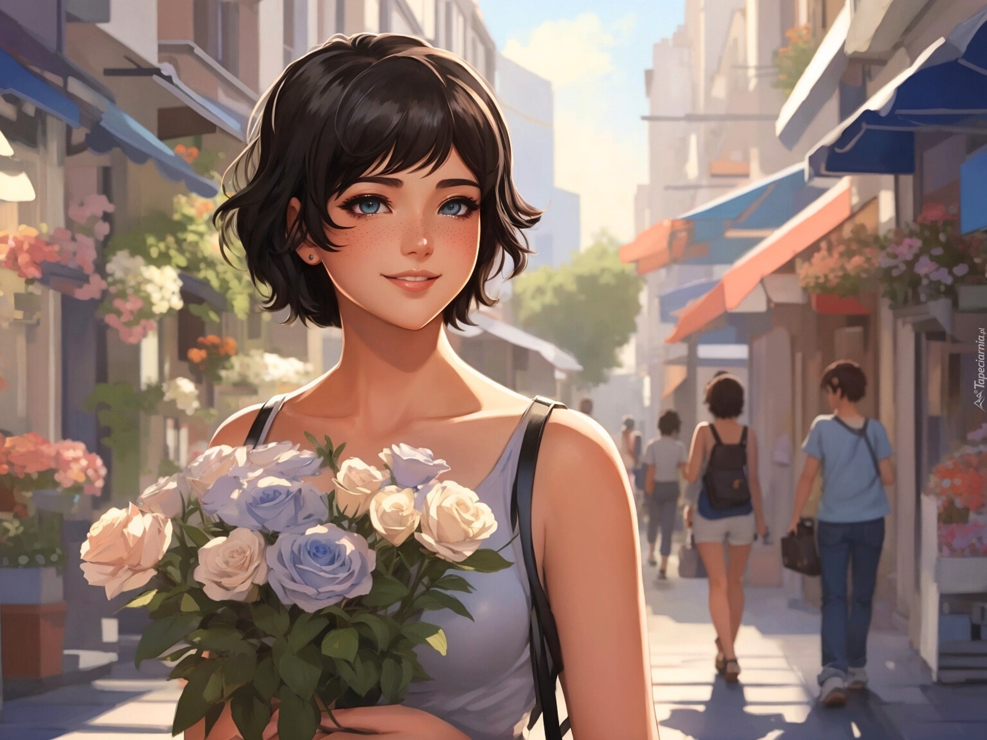 Edytor tapety: Dziewczyna z bukietem róż na ulicy w grafice