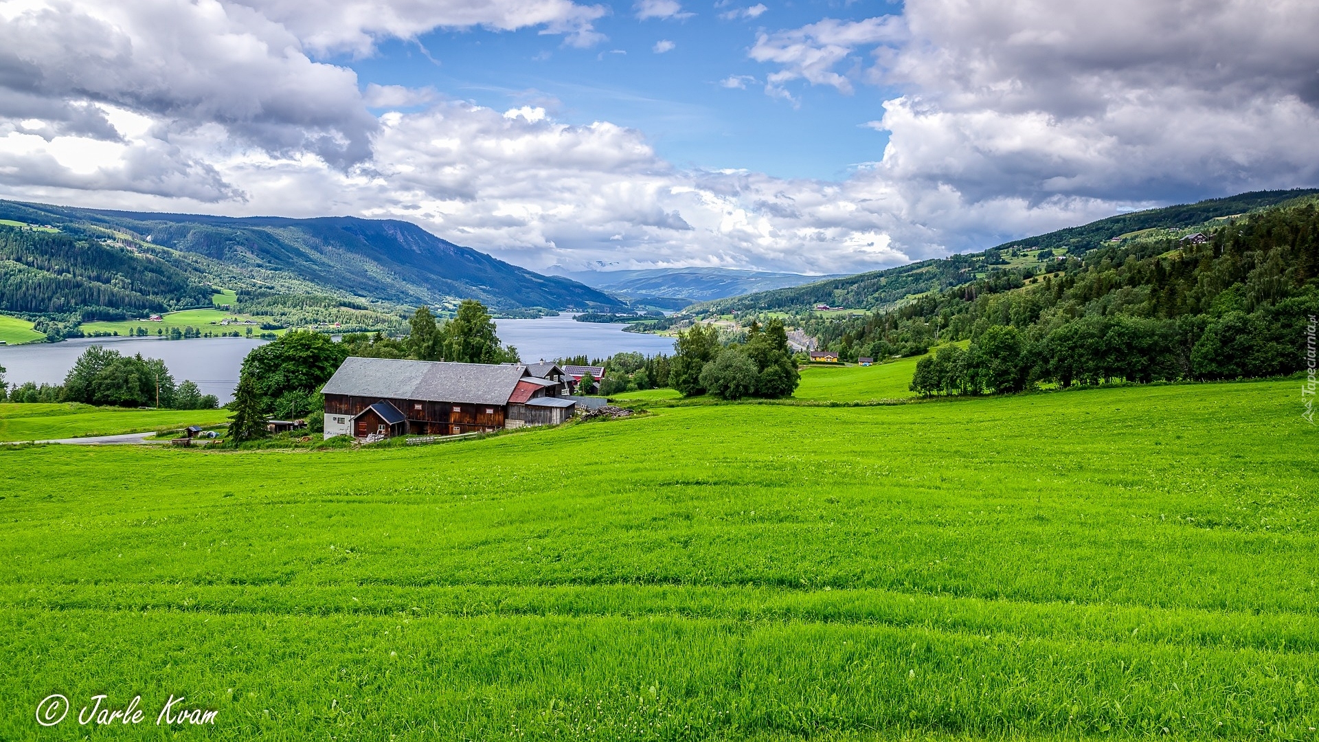 Edytor tapety: Dom i drzewa na wzgórzach nad jeziorem