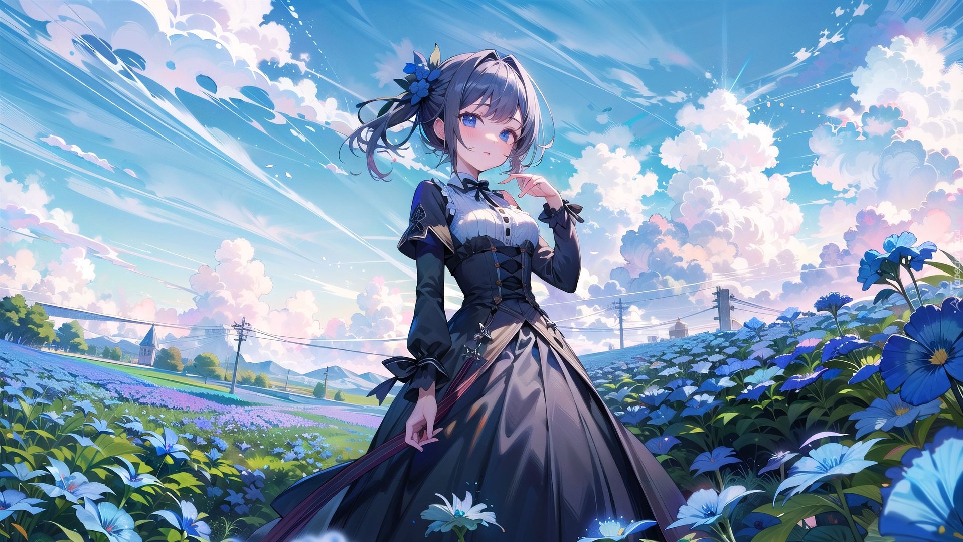 Edytor tapety: Dziewczynka w długiej sukience wśród kwiatów na polu