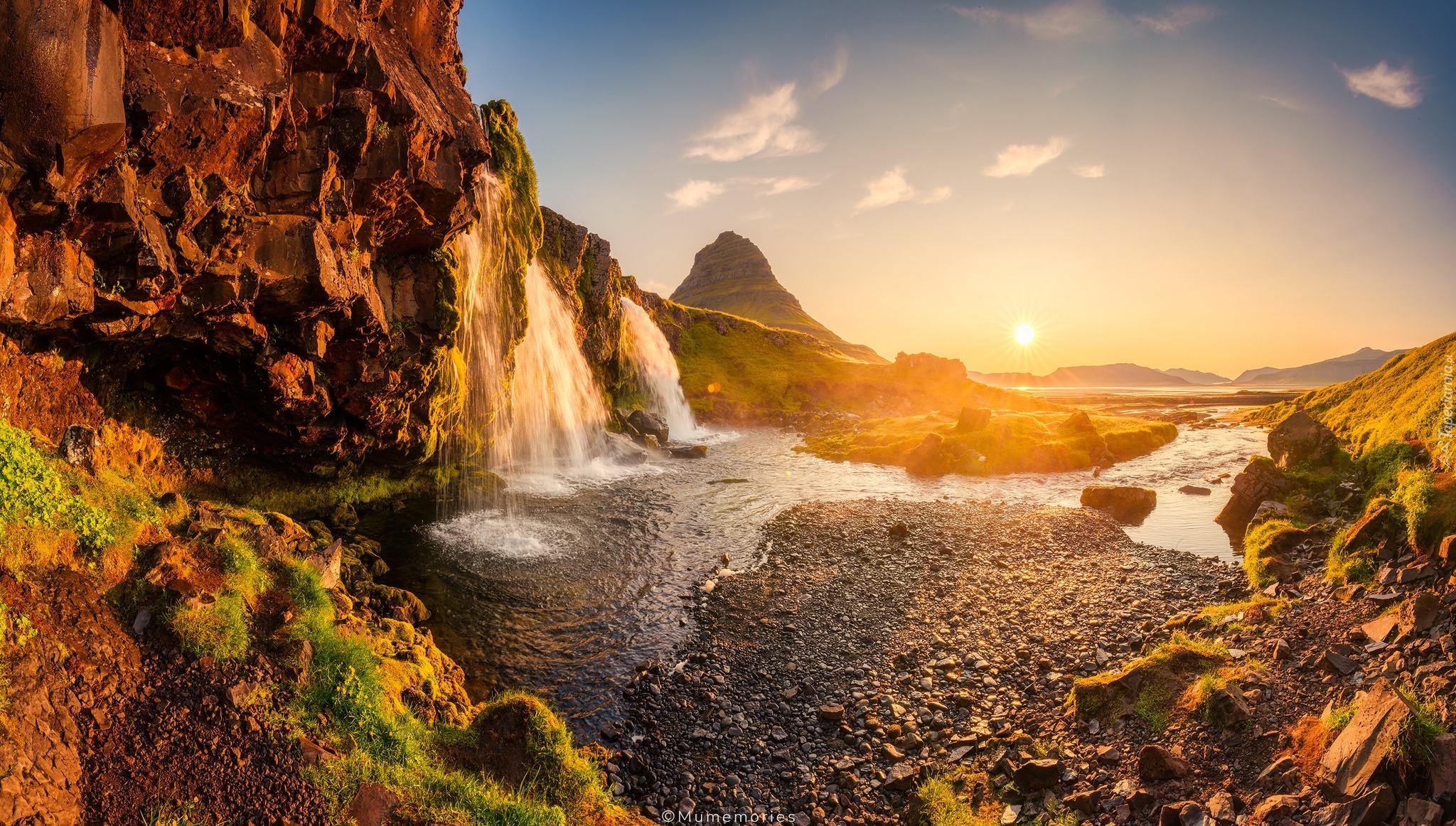 Edytor tapety: Wodospad Kirkjufell na skałach w świetle wschodzącego słońca