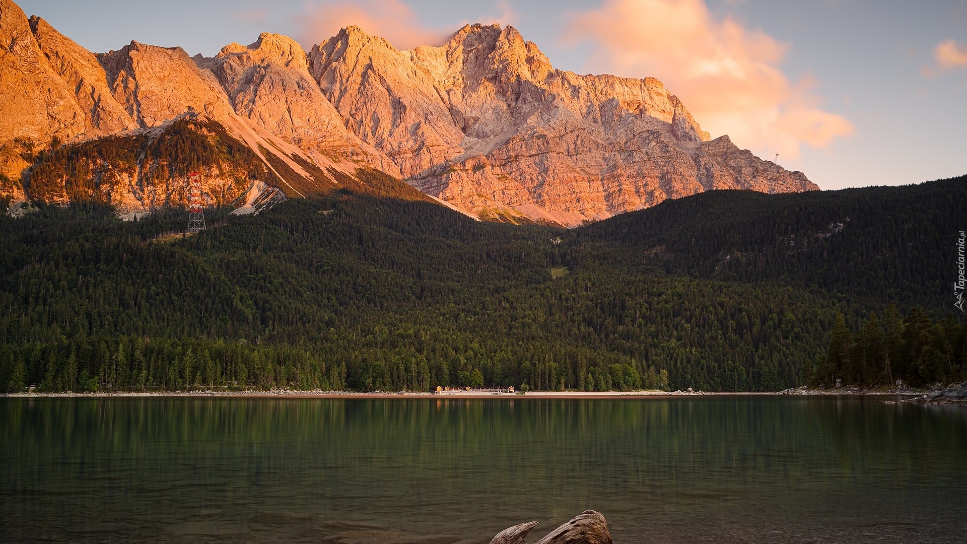 Edytor tapety: Rozświetlone słońcem góry i las nad jeziorem