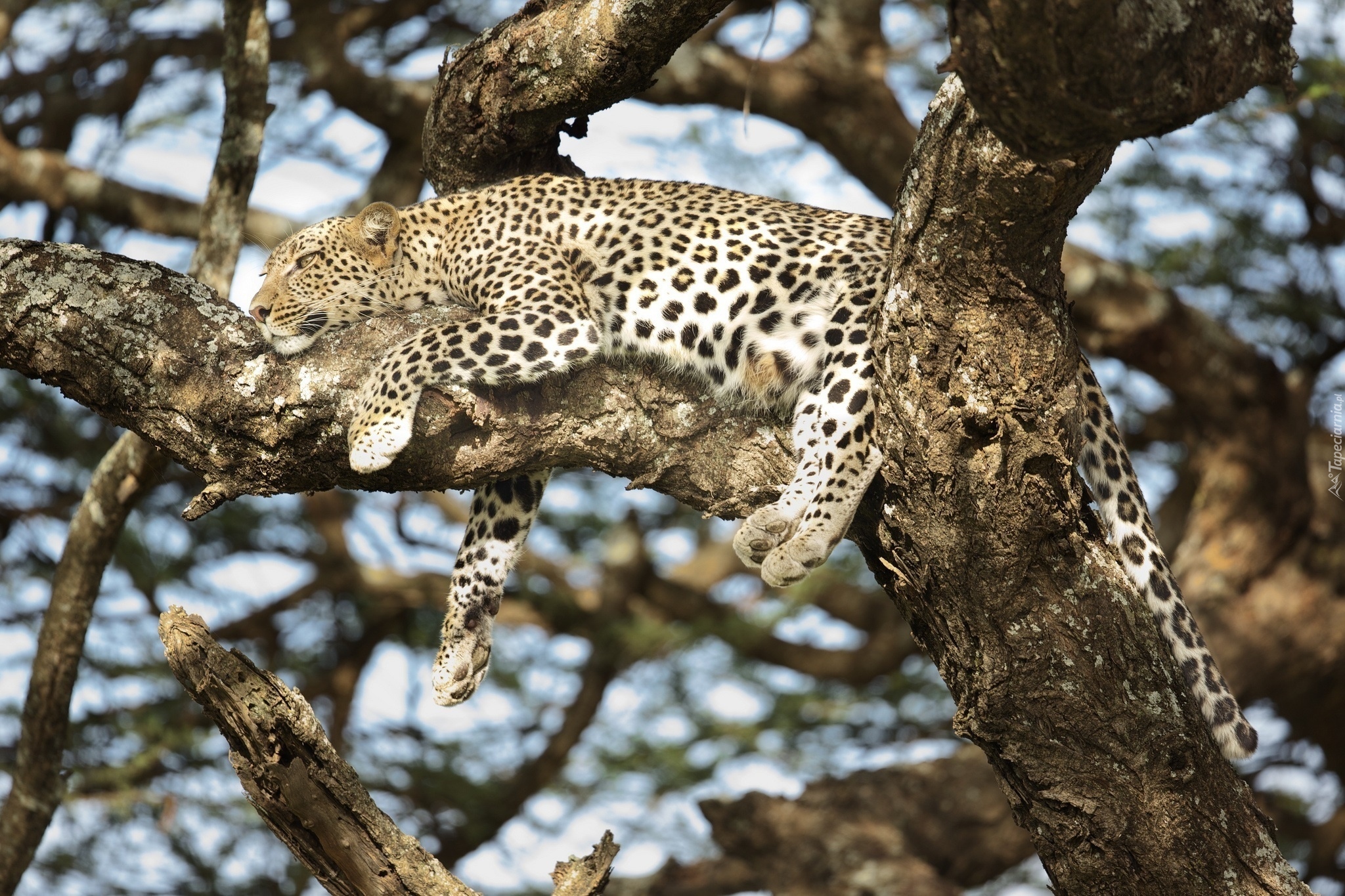 Edytor tapety: Lampart odpoczywający na suchym drzewie