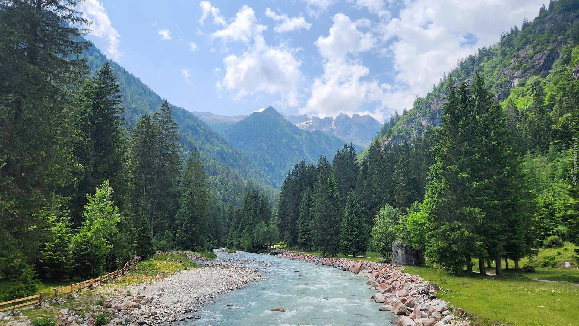 Edytor tapety: Kamienie na brzegach rzeki i zalesione góry