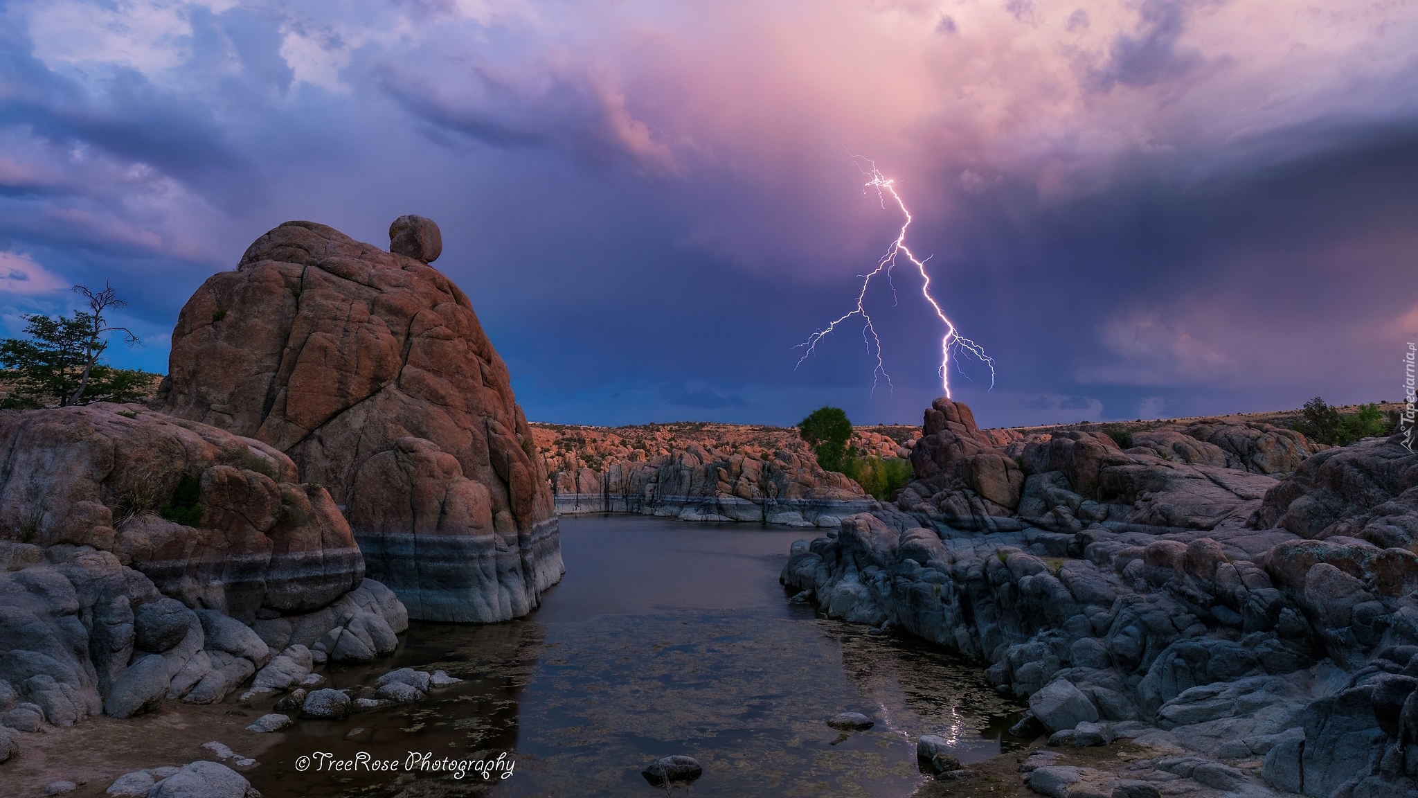 Edytor tapety: Piorun nad jeziorem Watson Lake i skałami