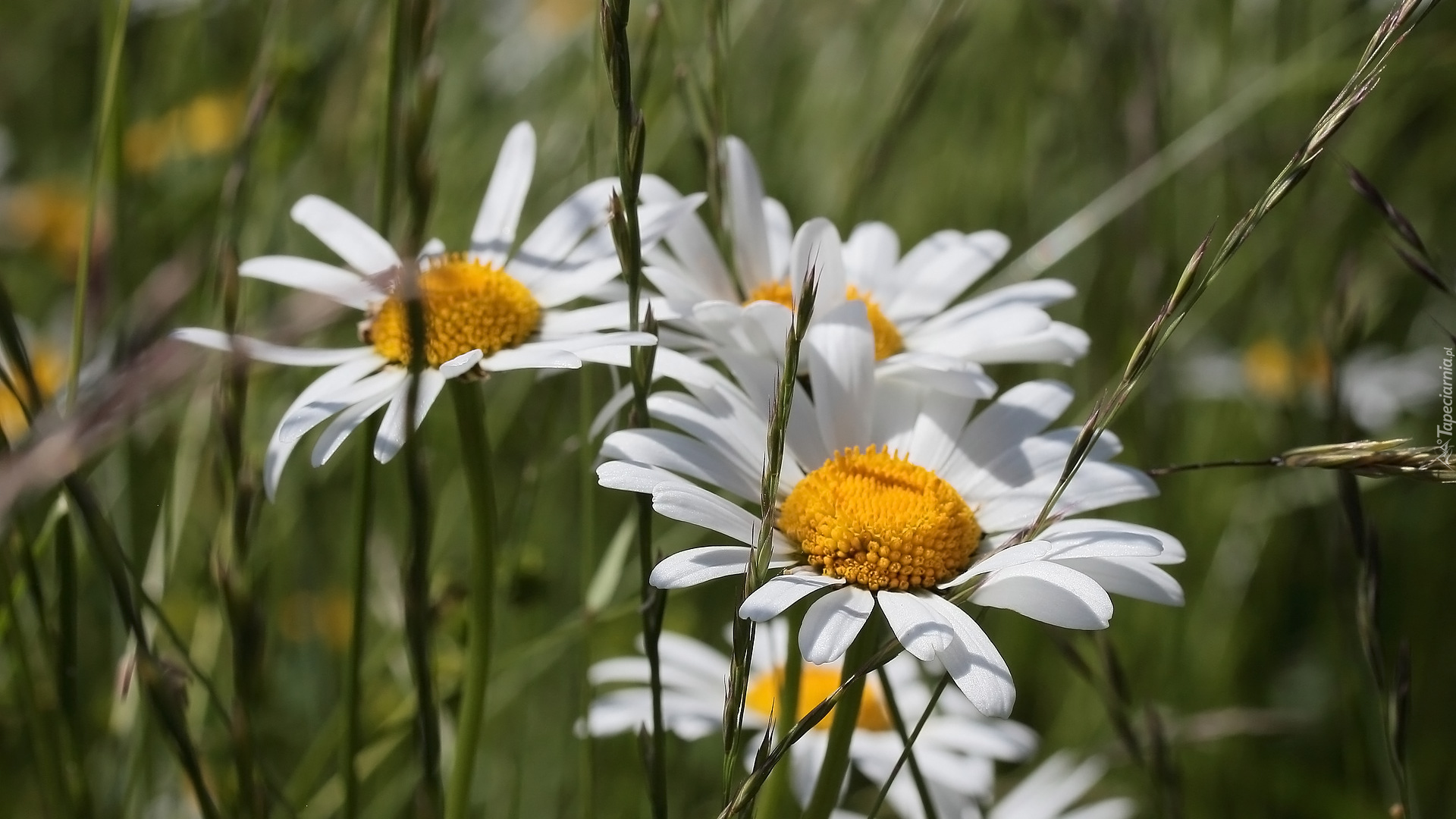 Edytor tapety: Rozświetlone stokrotki w trawie