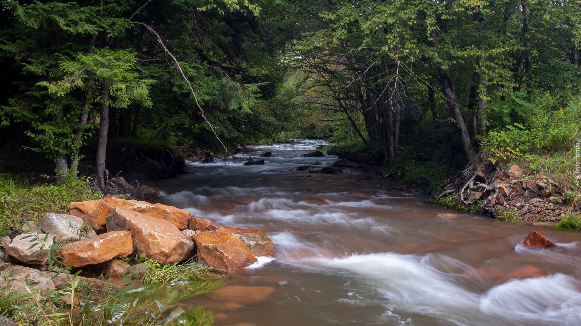 Edytor tapety: Kamienie ułożone na brzegu leśnej rzeki