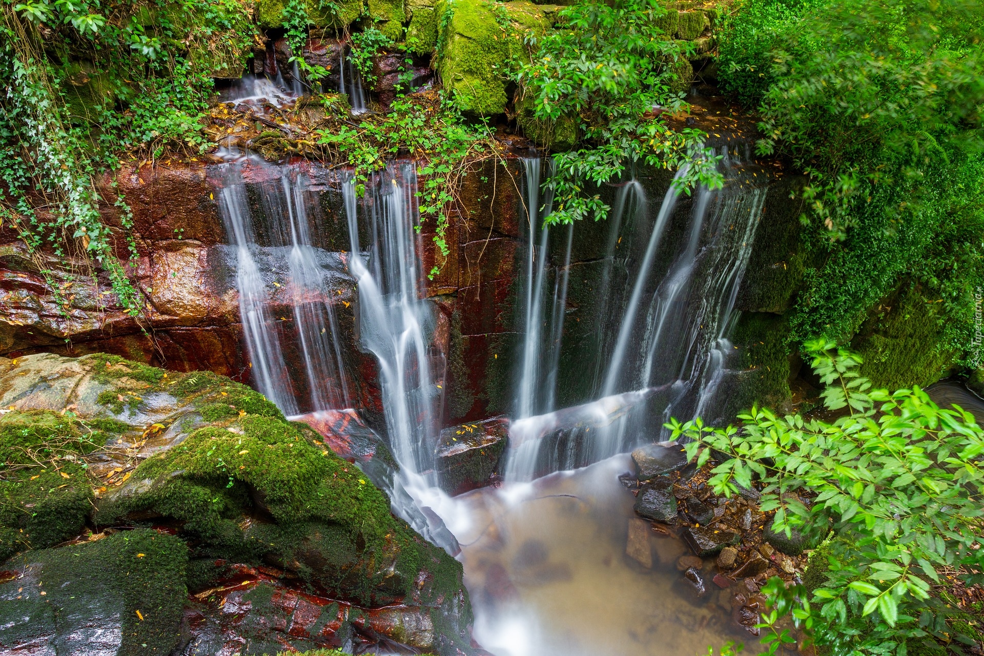 Edytor tapety: Roślinność i drzewa przy wodospadzie spływającym po skałach