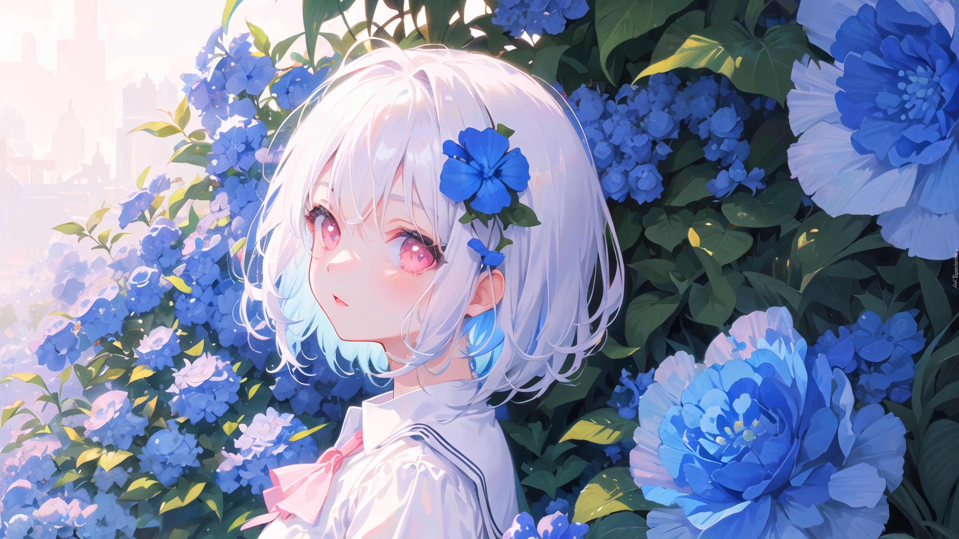 Edytor tapety: Dziewczyna z niebieskim kwiatkiem we włosach w anime