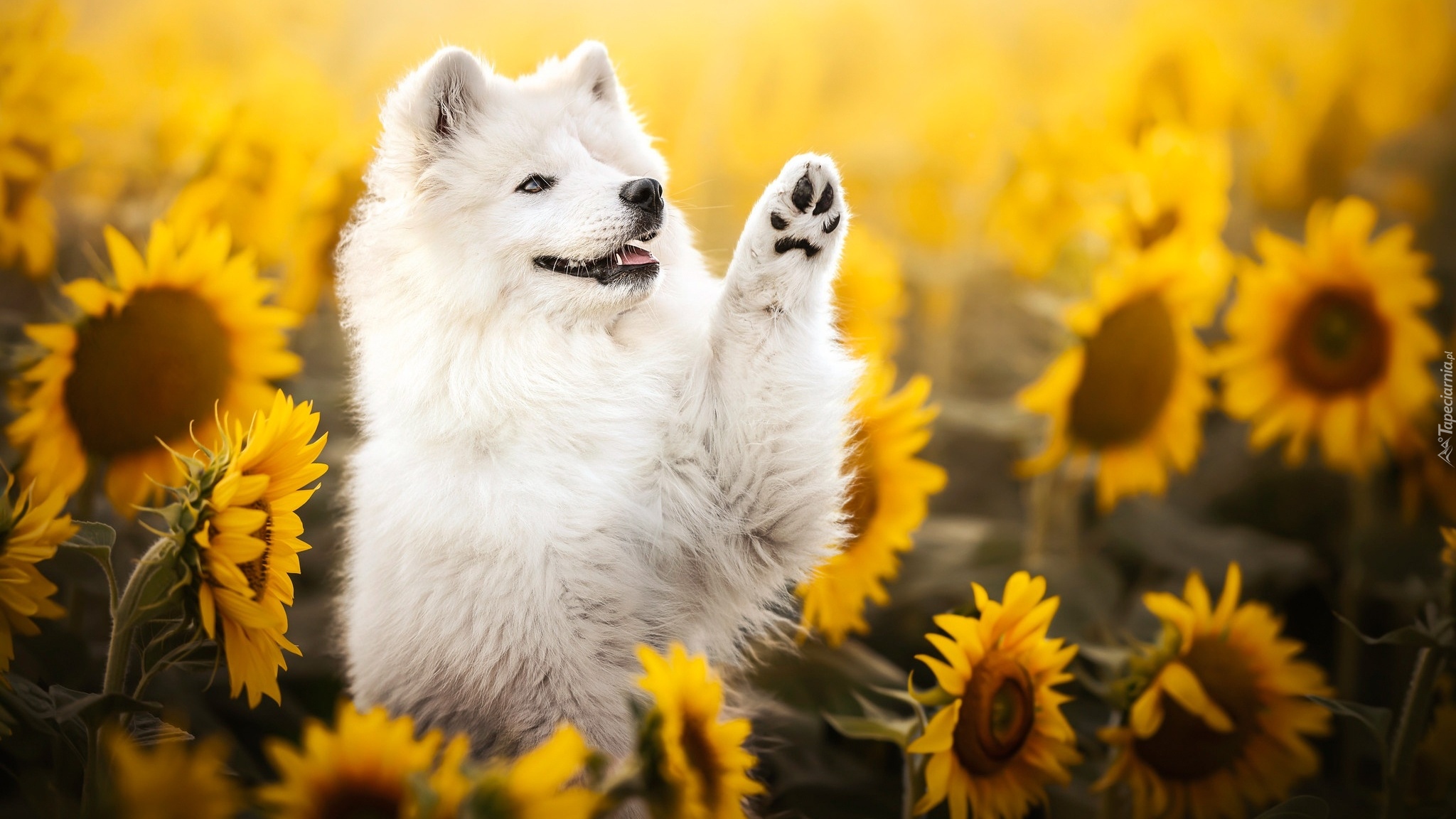 Edytor tapety: Samojed wśród słoneczników