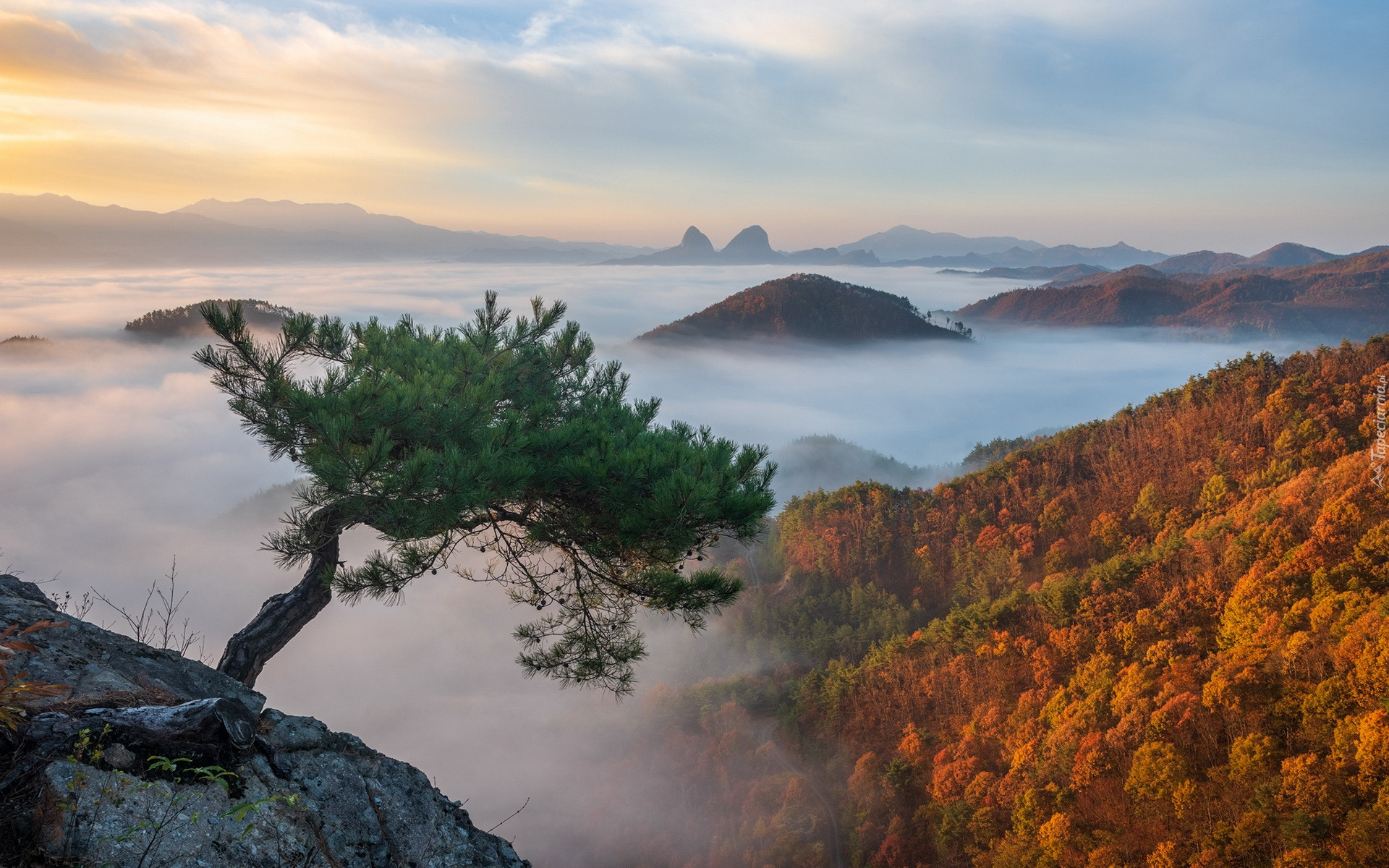 Edytor tapety: Sosna na skale na tle zamglonych gór jesienią