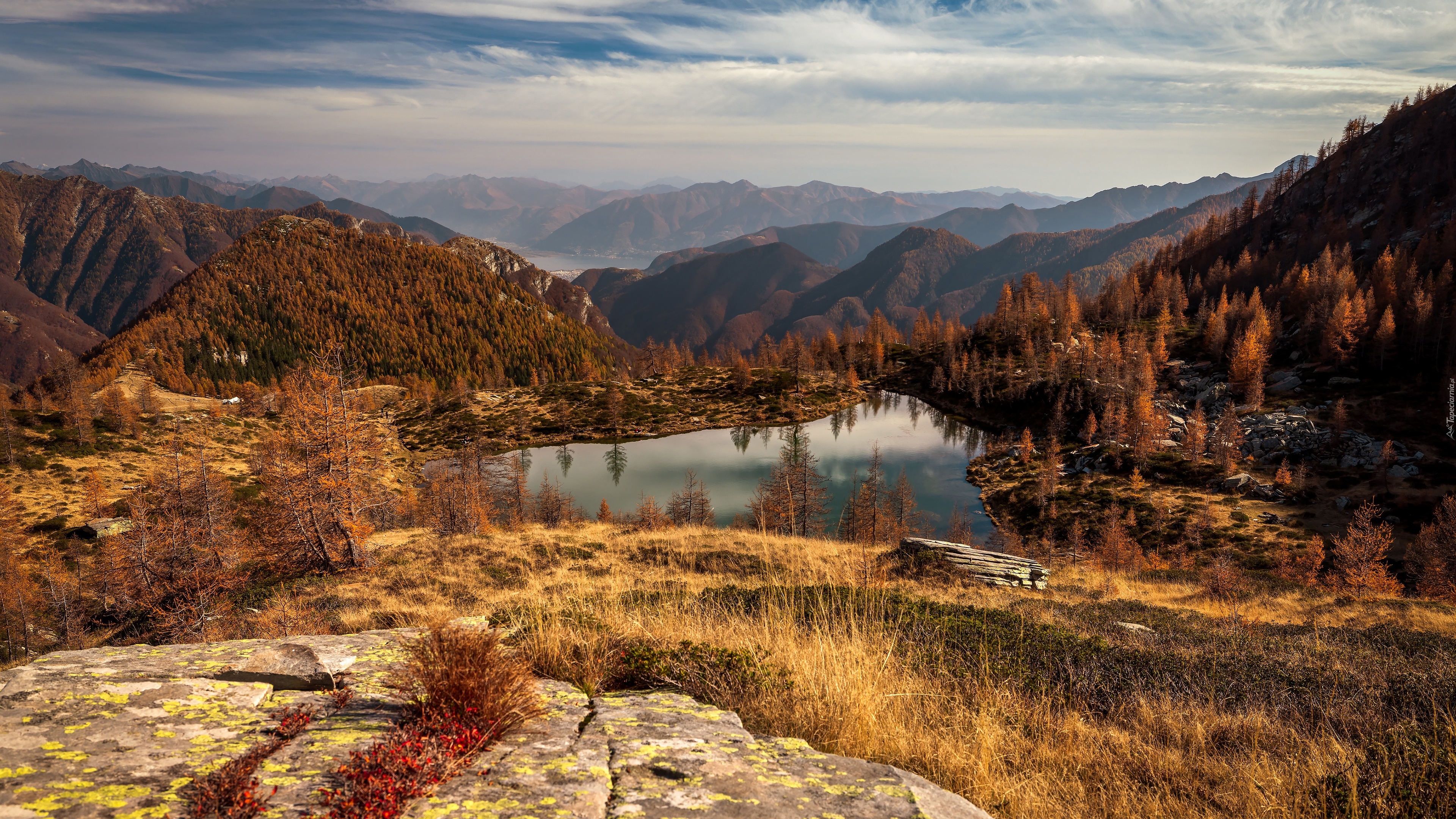Edytor tapety: Skały i zalesione jesiennymi drzewami góry nad jeziorem
