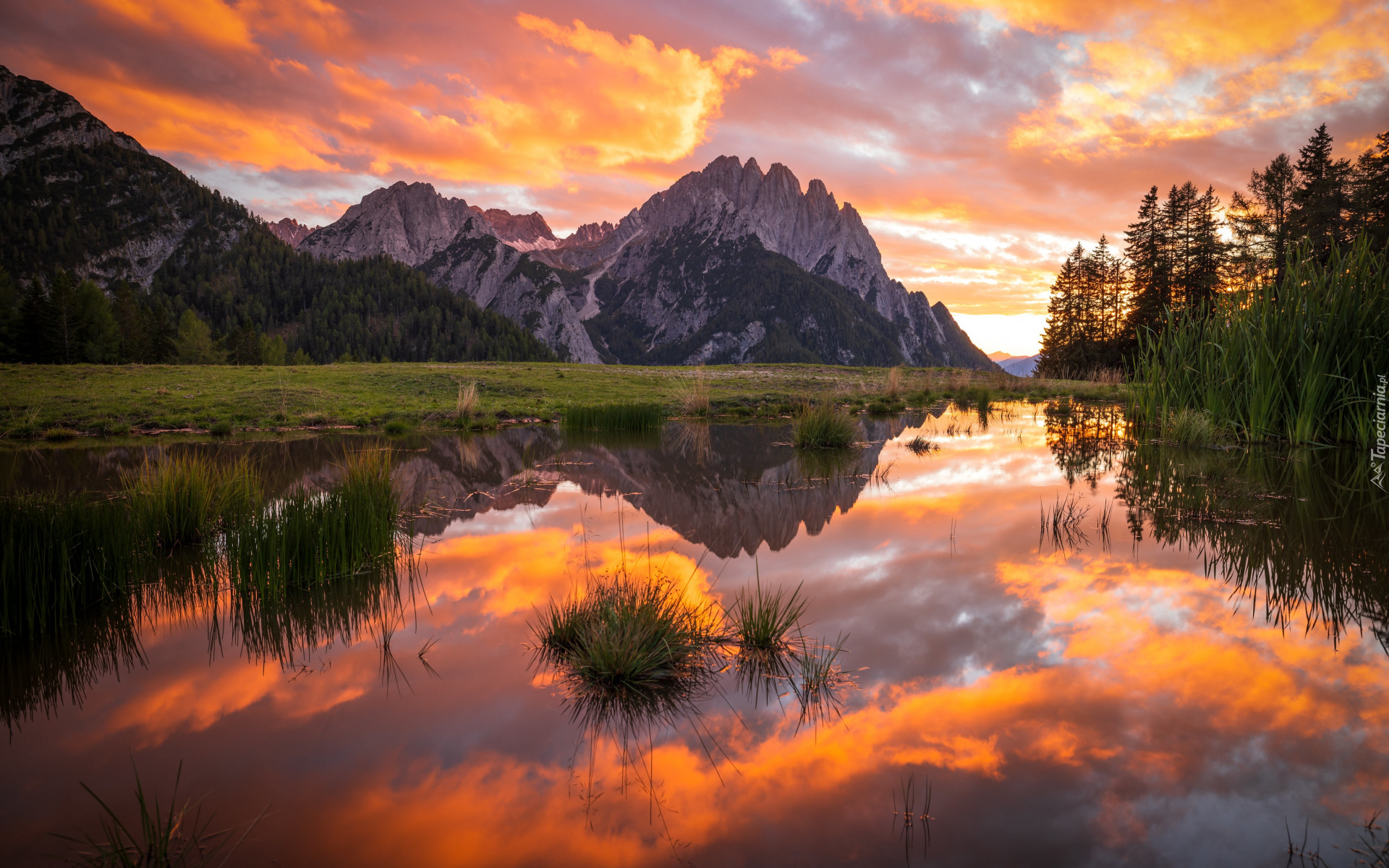 Edytor tapety: Odbicie kolorowych chmur i gór w jeziorze
