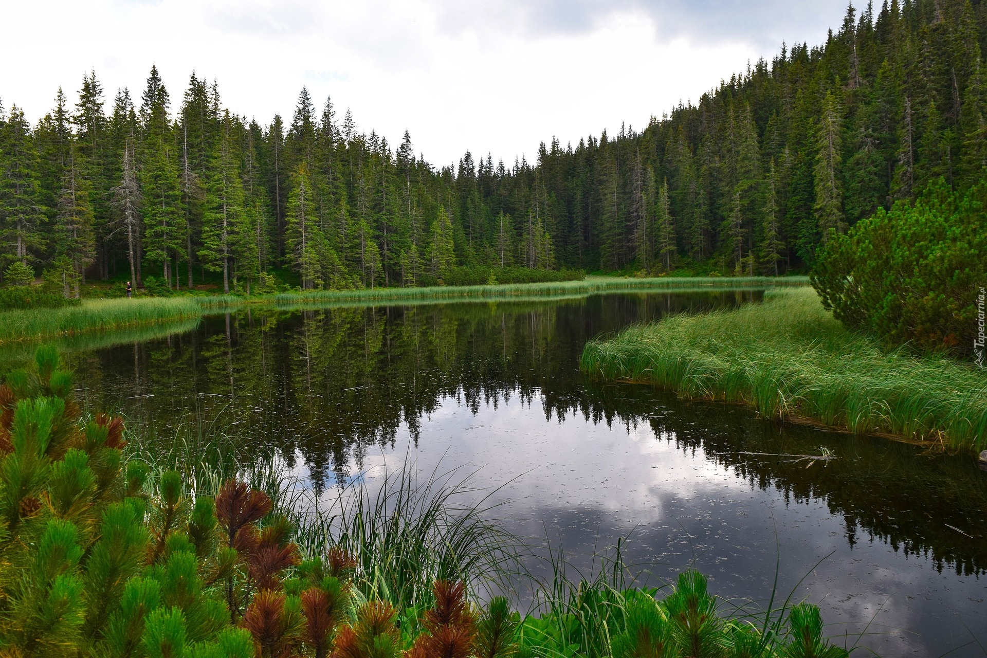 Edytor tapety: Szuwary na jeziorze w lesie iglastym