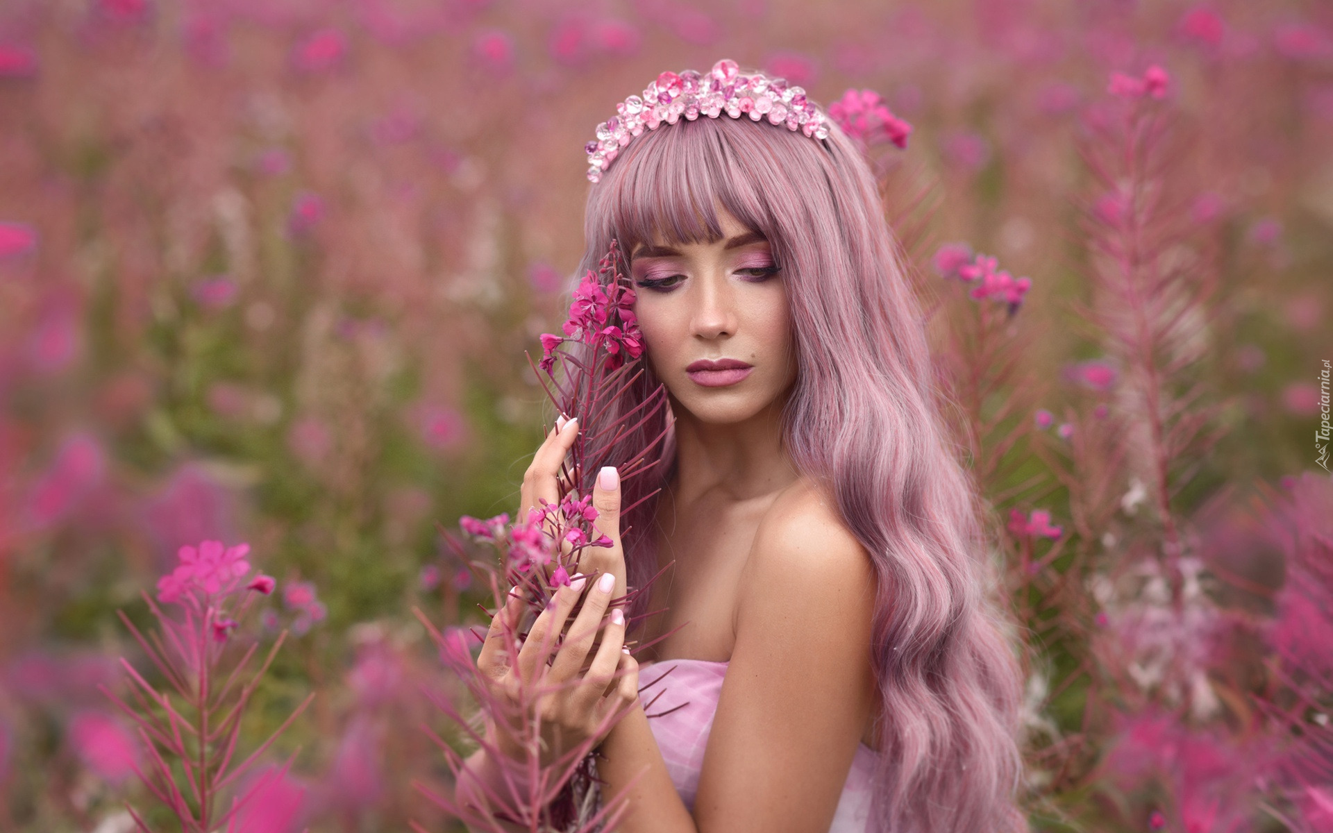 Edytor tapety: Różowowłosa kobieta w kwiatach na rozmytym tle