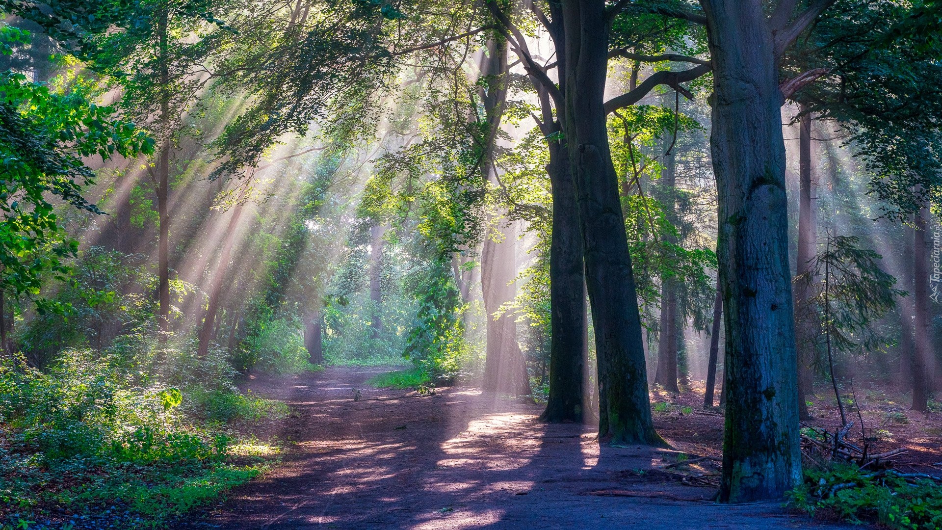 Edytor tapety: Drzewa przy drodze rozświetlone słońcem