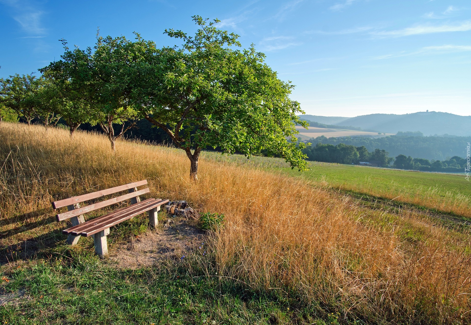 Edytor tapety: Drzewa i ławka w trawie na wzgórzu