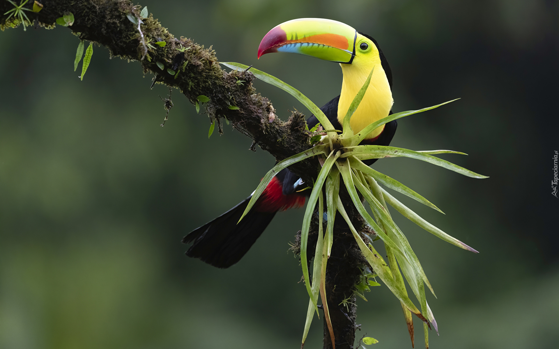 Edytor tapety: Tukan tęczodzioby na omszałej gałęzi w zbliżeniu