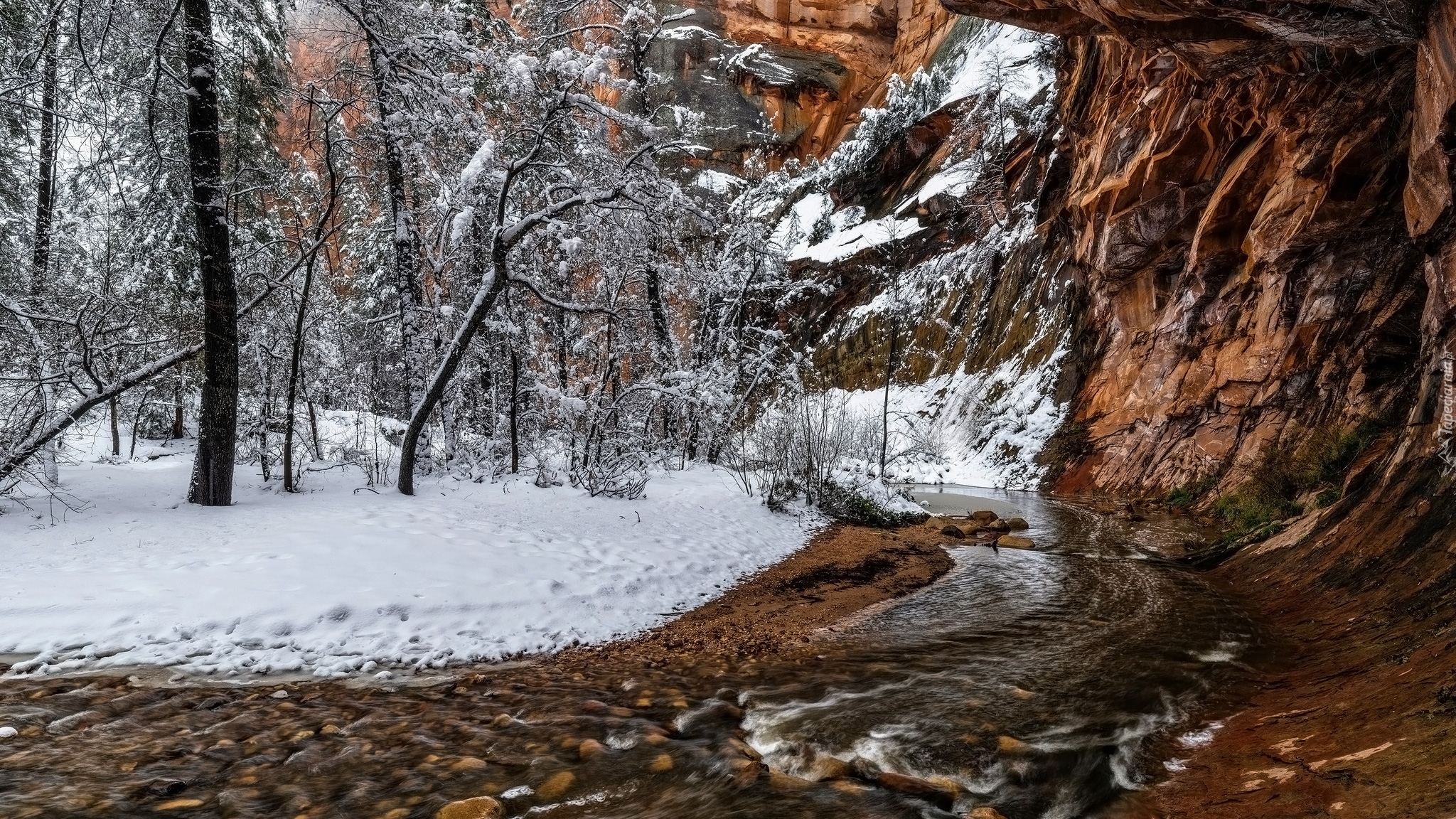 Edytor tapety: Ośnieżone drzewa i rzeka pod skałami w górach