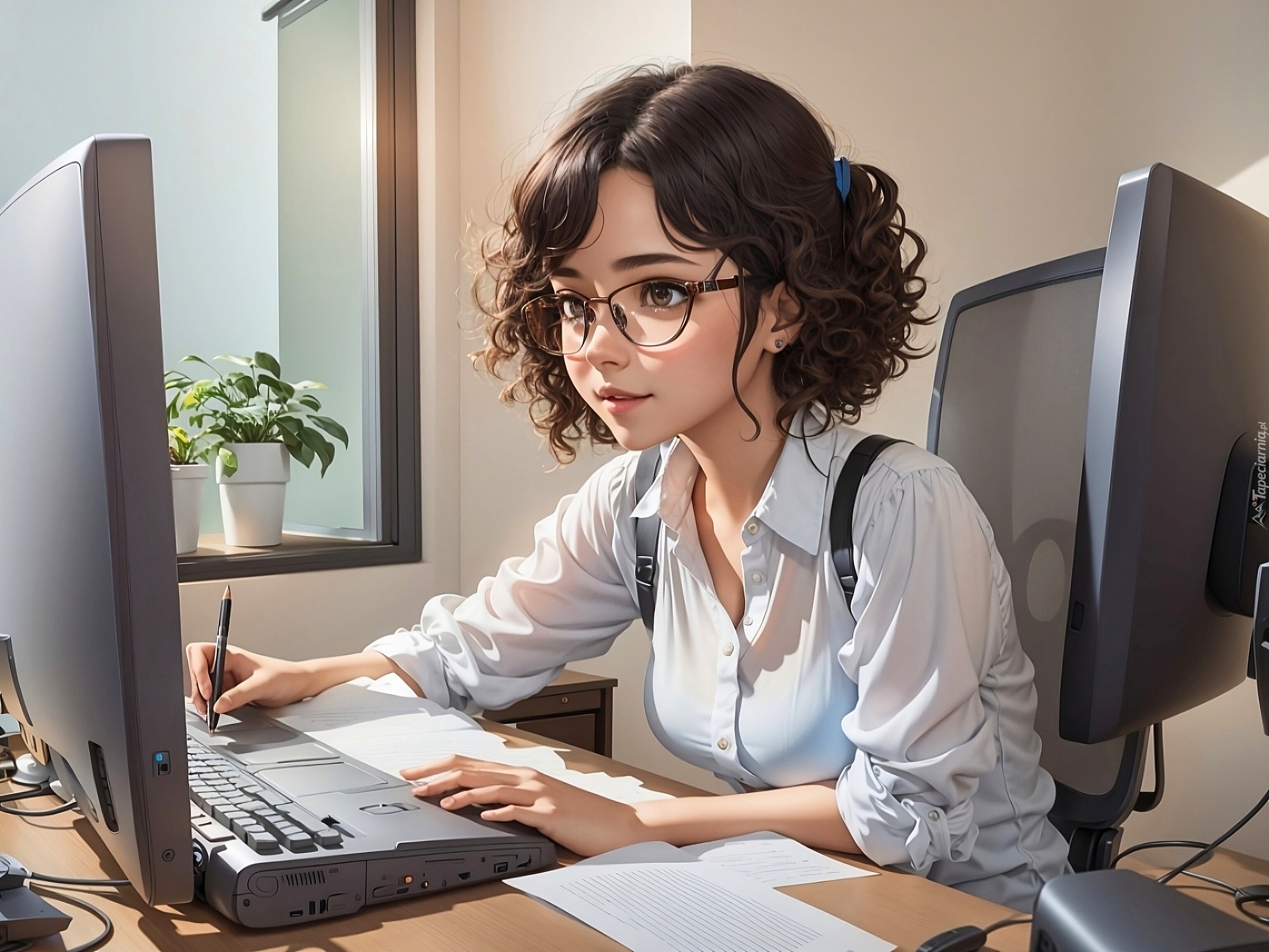 Edytor tapety: Dziewczyna w okularach przy komputerze w grafice