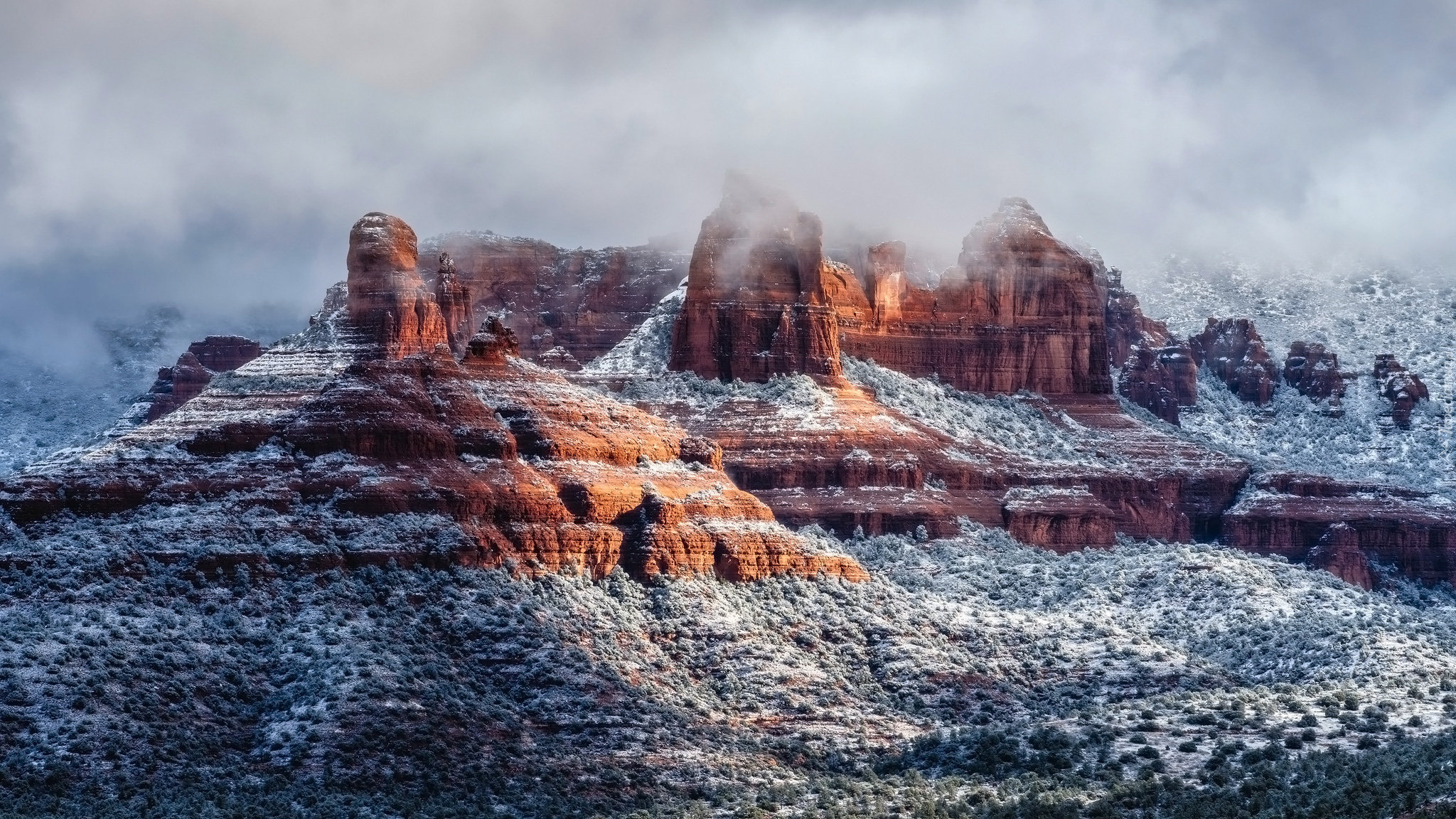 Edytor tapety: Ośnieżone góry w Sedonie we mgle