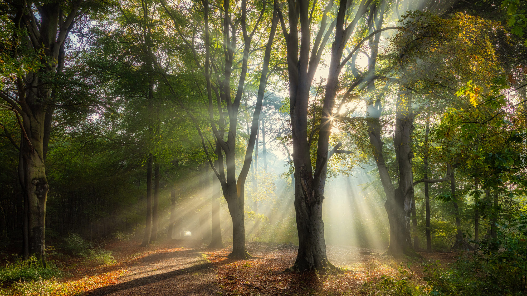 Edytor tapety: Przebijające wśród drzew promienie słońca
