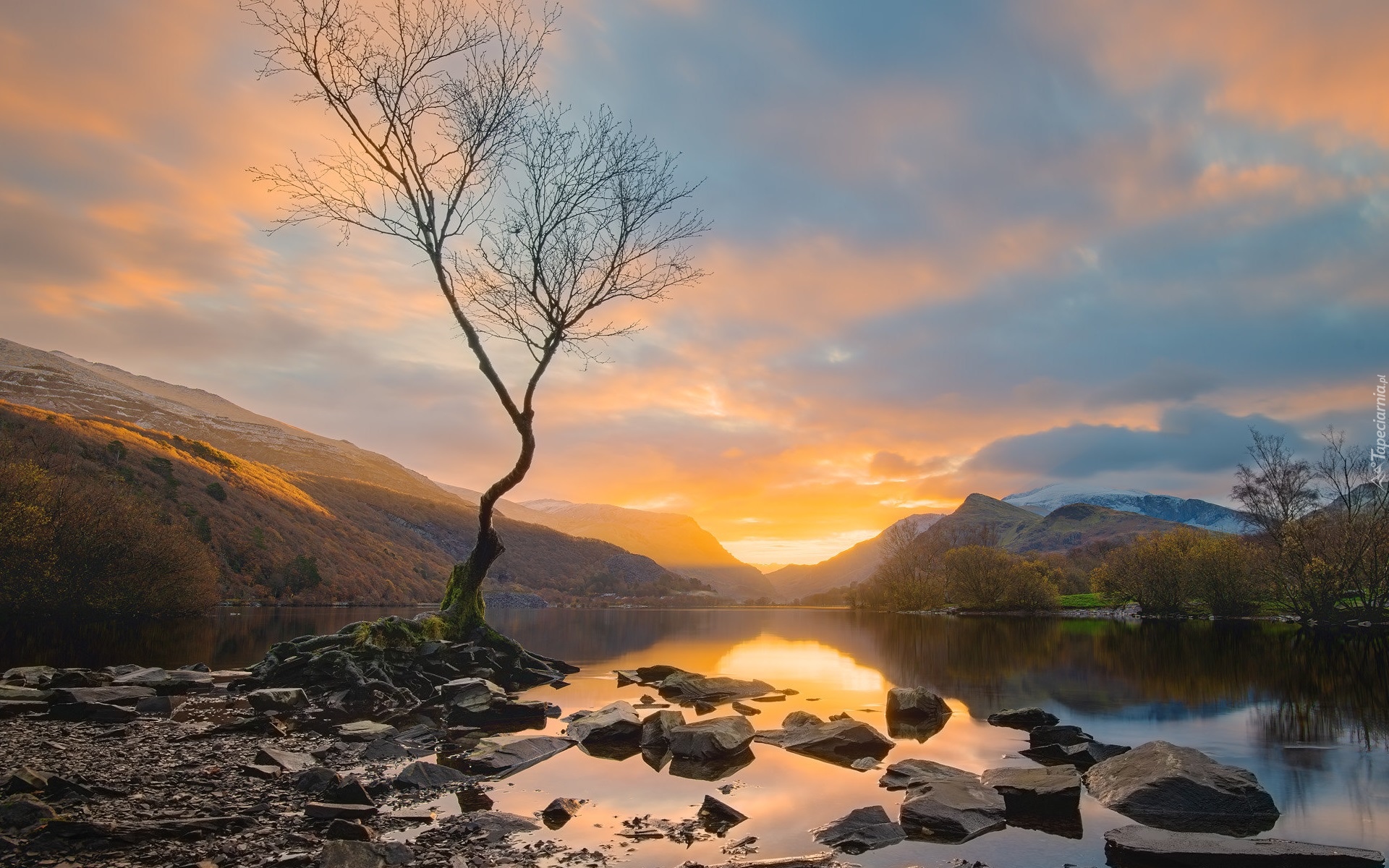 Edytor tapety: Bezlistne drzewo nad jeziorem Llyn Padarn