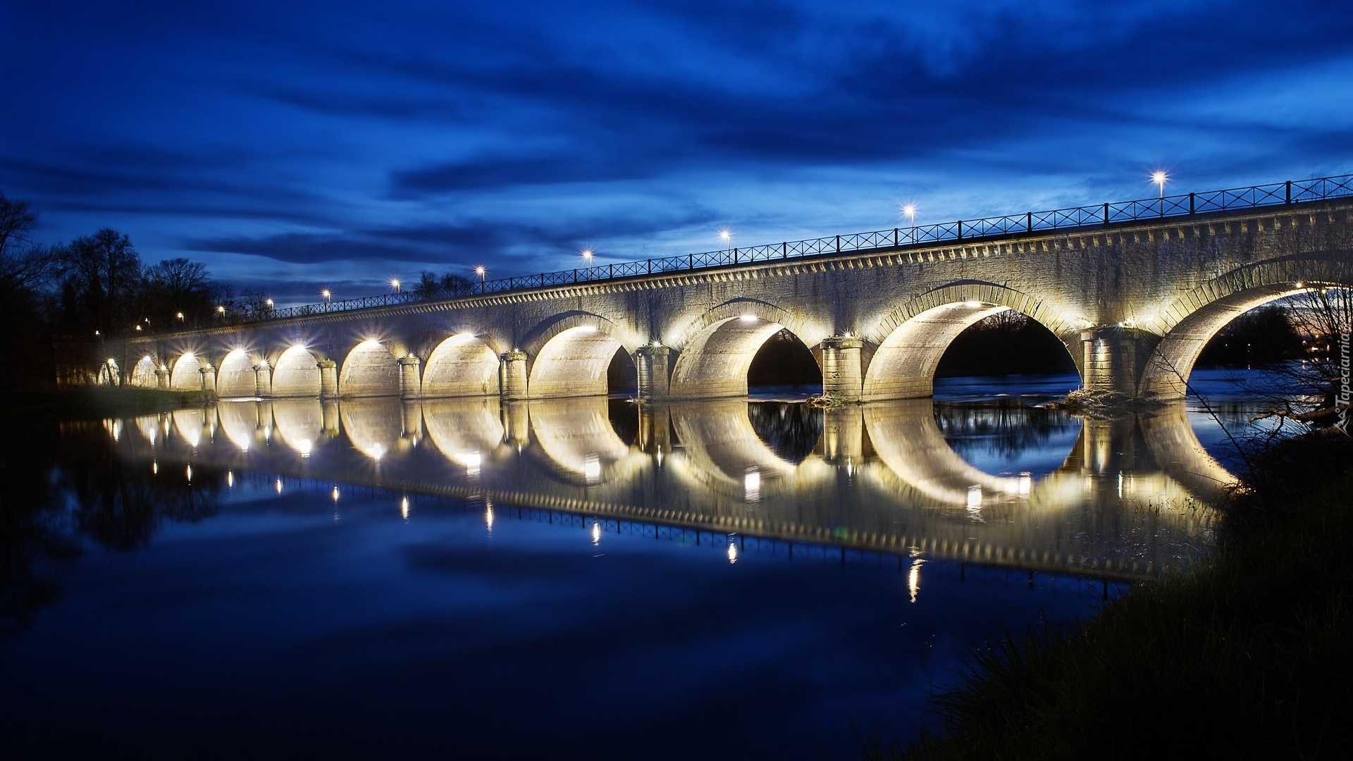 Edytor tapety: Oświetlony nocą most nad rzeką