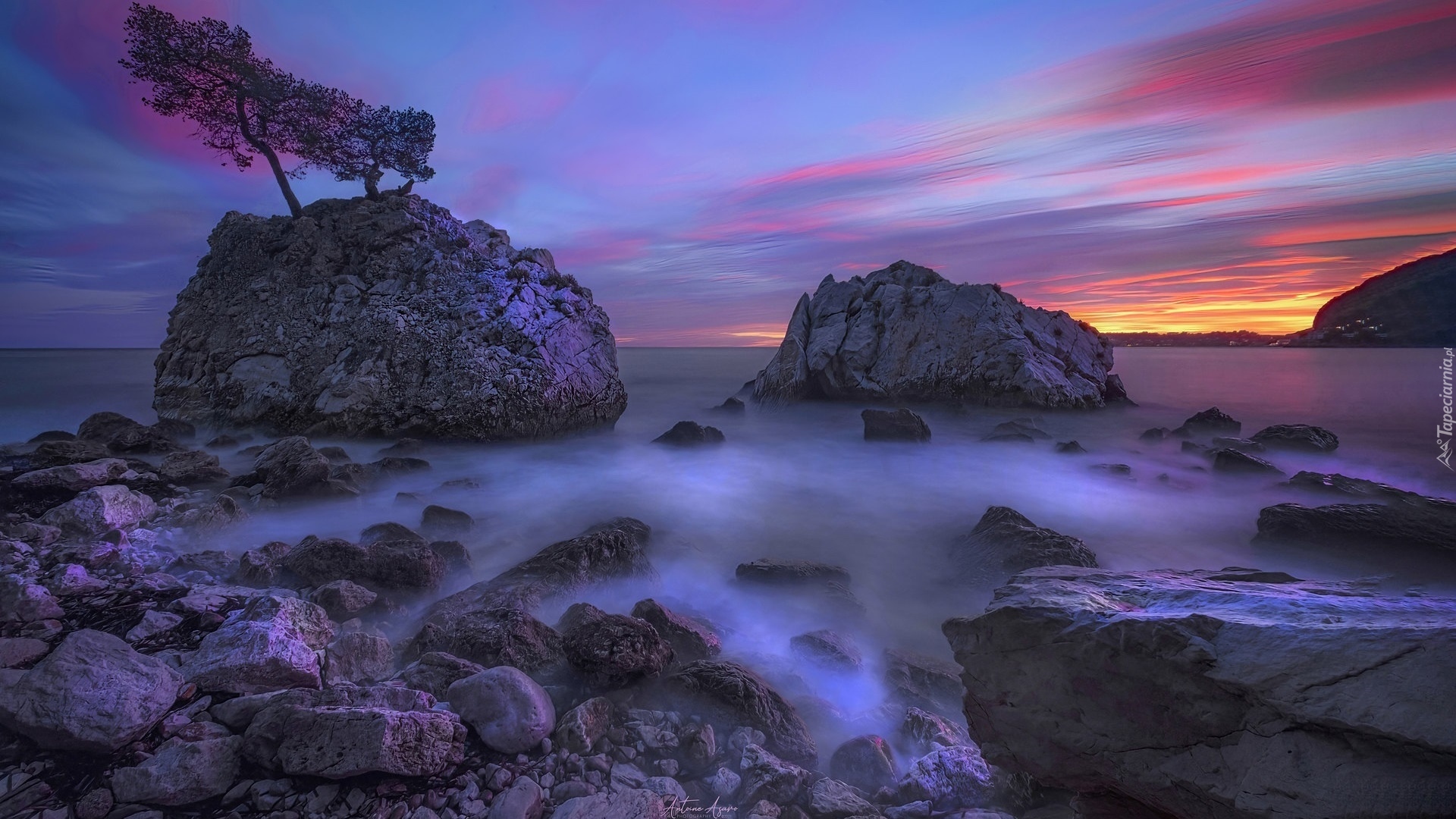 Edytor tapety: Drzewo na skałach w morzu pod kolorowym niebem
