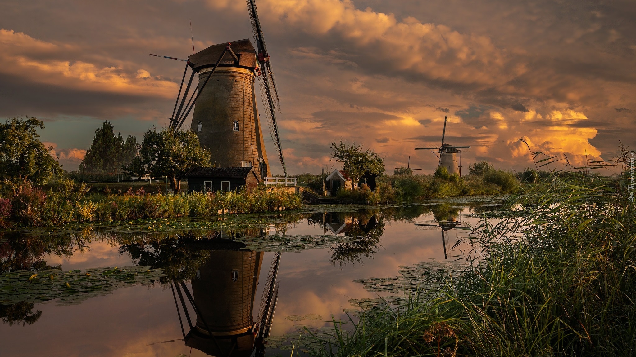Edytor tapety: Wiatraki i rośliny nad kanałem w Kinderdijk