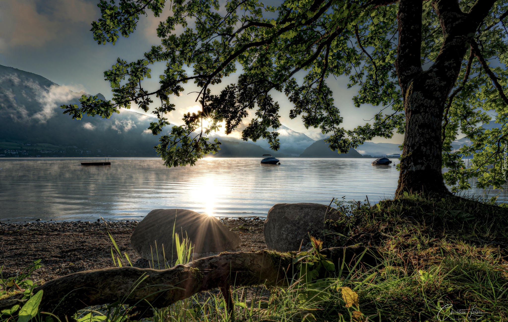Edytor tapety: Drzewo na brzegu górskiego jeziora Wolfgang w Austrii