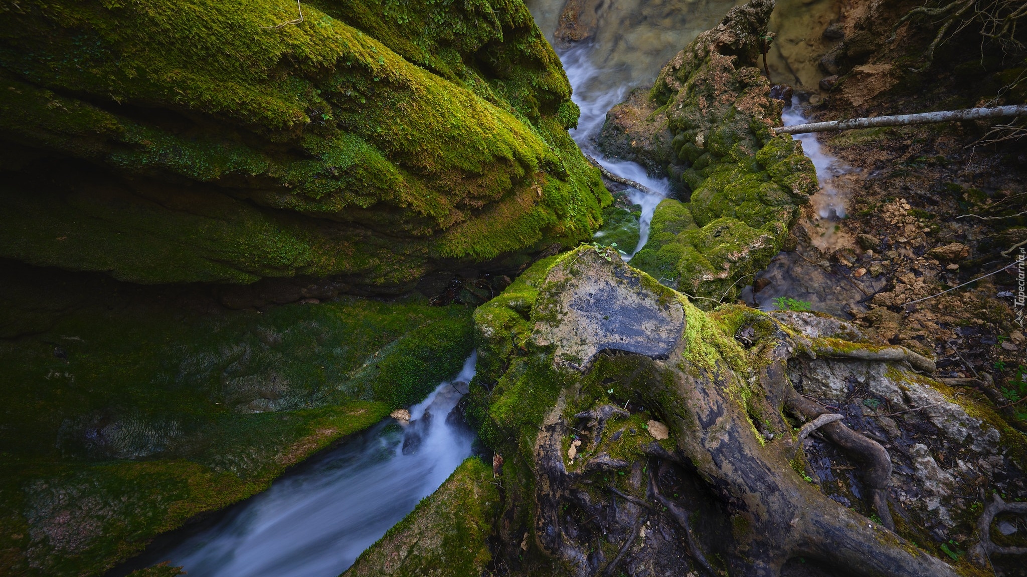 Edytor tapety: Potok pomiędzy omszałymi skałami