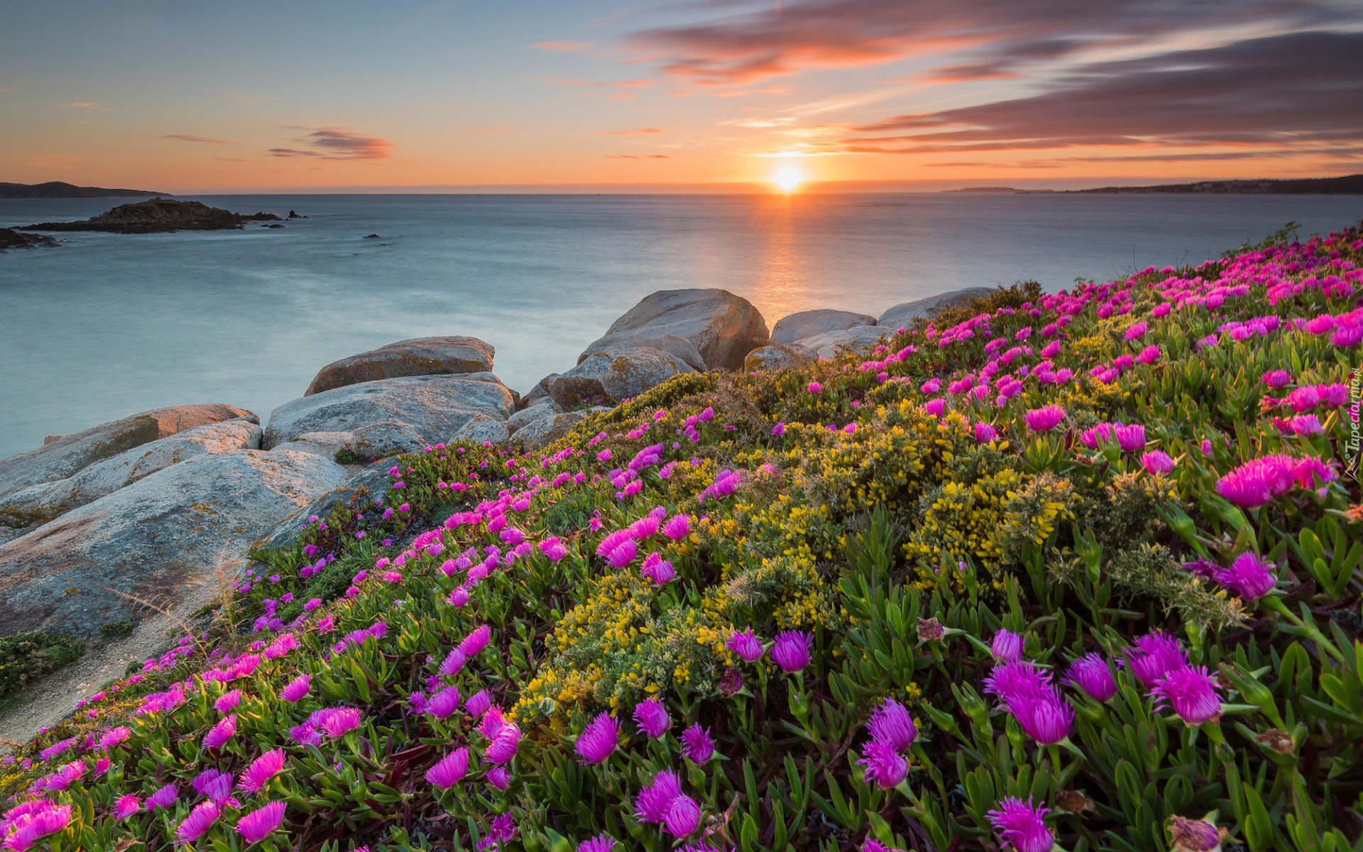 Edytor tapety: Różowe kwiaty i kamienie na brzegu morza