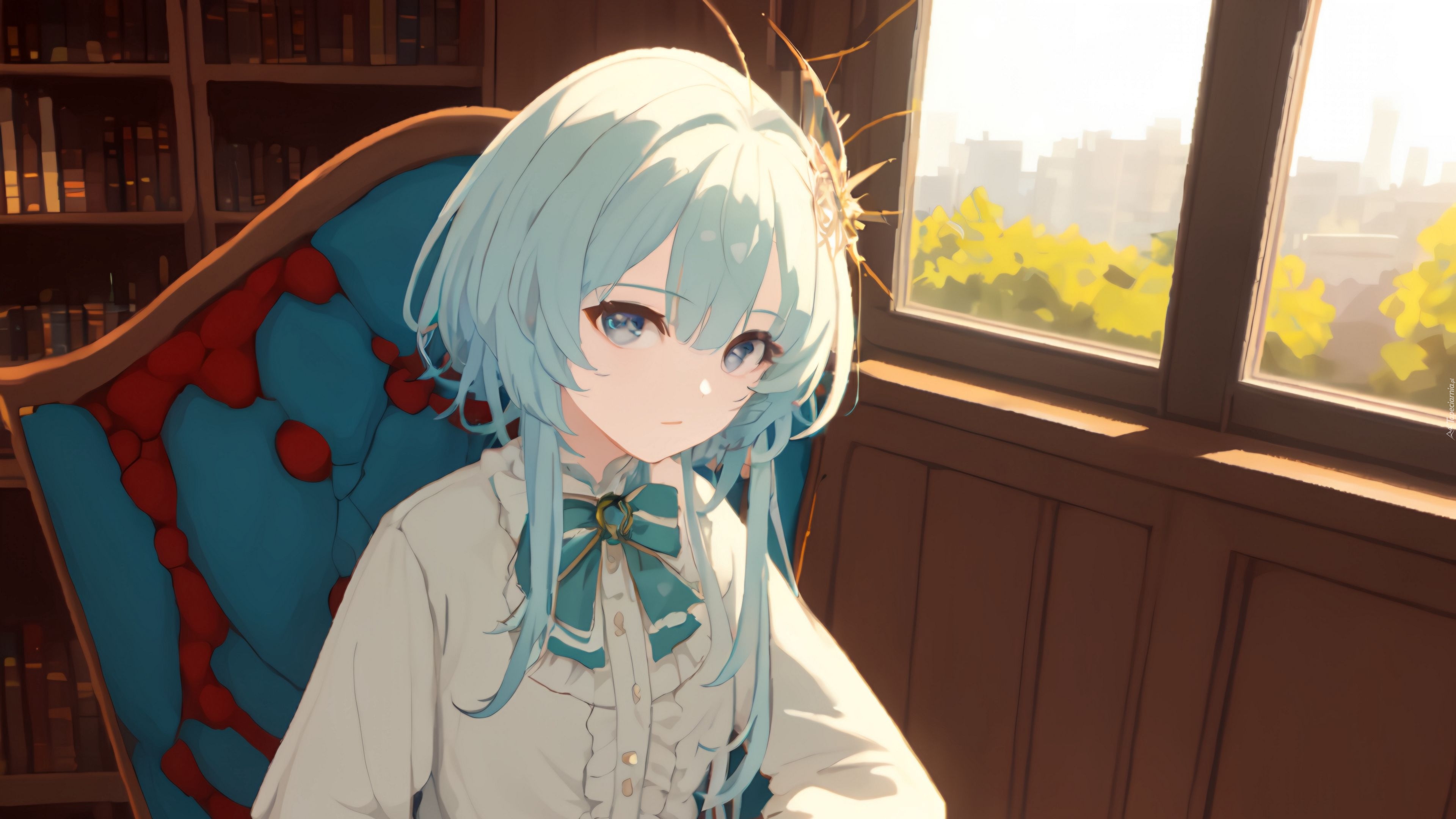 Edytor tapety: Dziewczyna siedząca przy oknie w anime