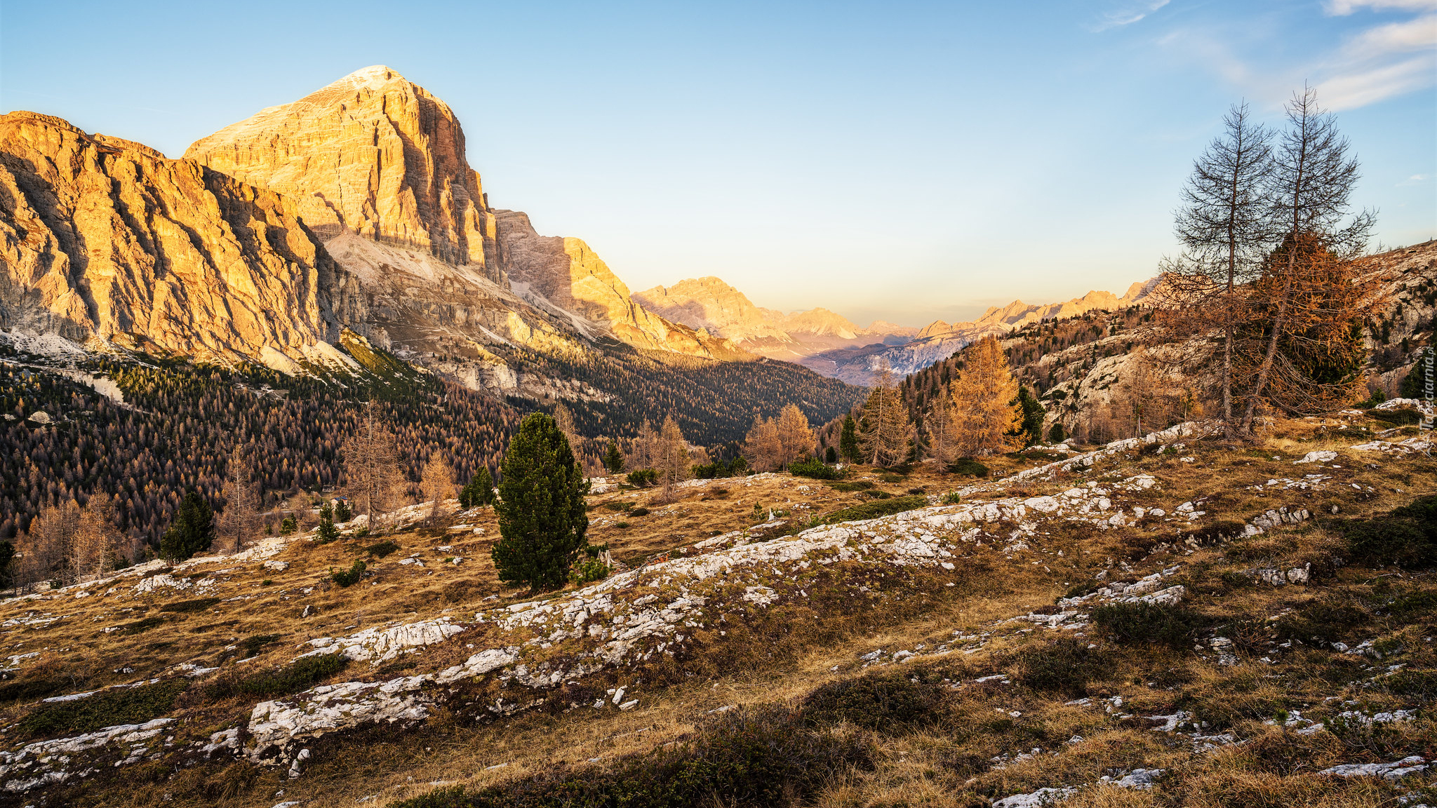 Edytor tapety: Drzewa na kamienistym wzgórzu i rozświetlone Dolomity