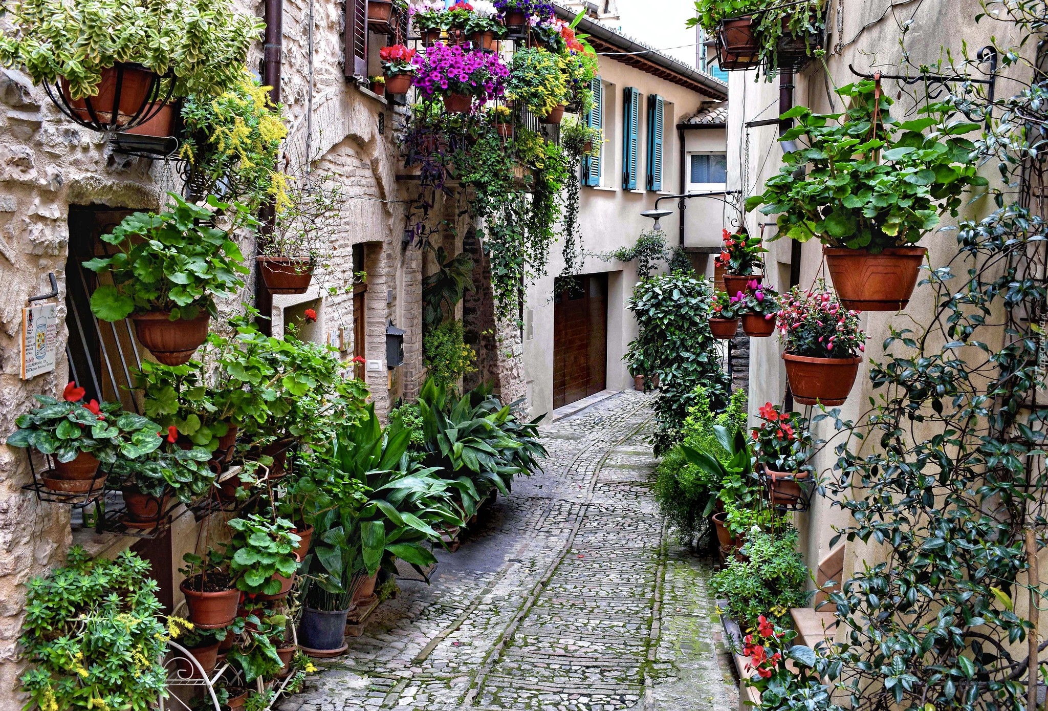 Edytor tapety: Doniczki z kwiatami na fasadach domów w Spello
