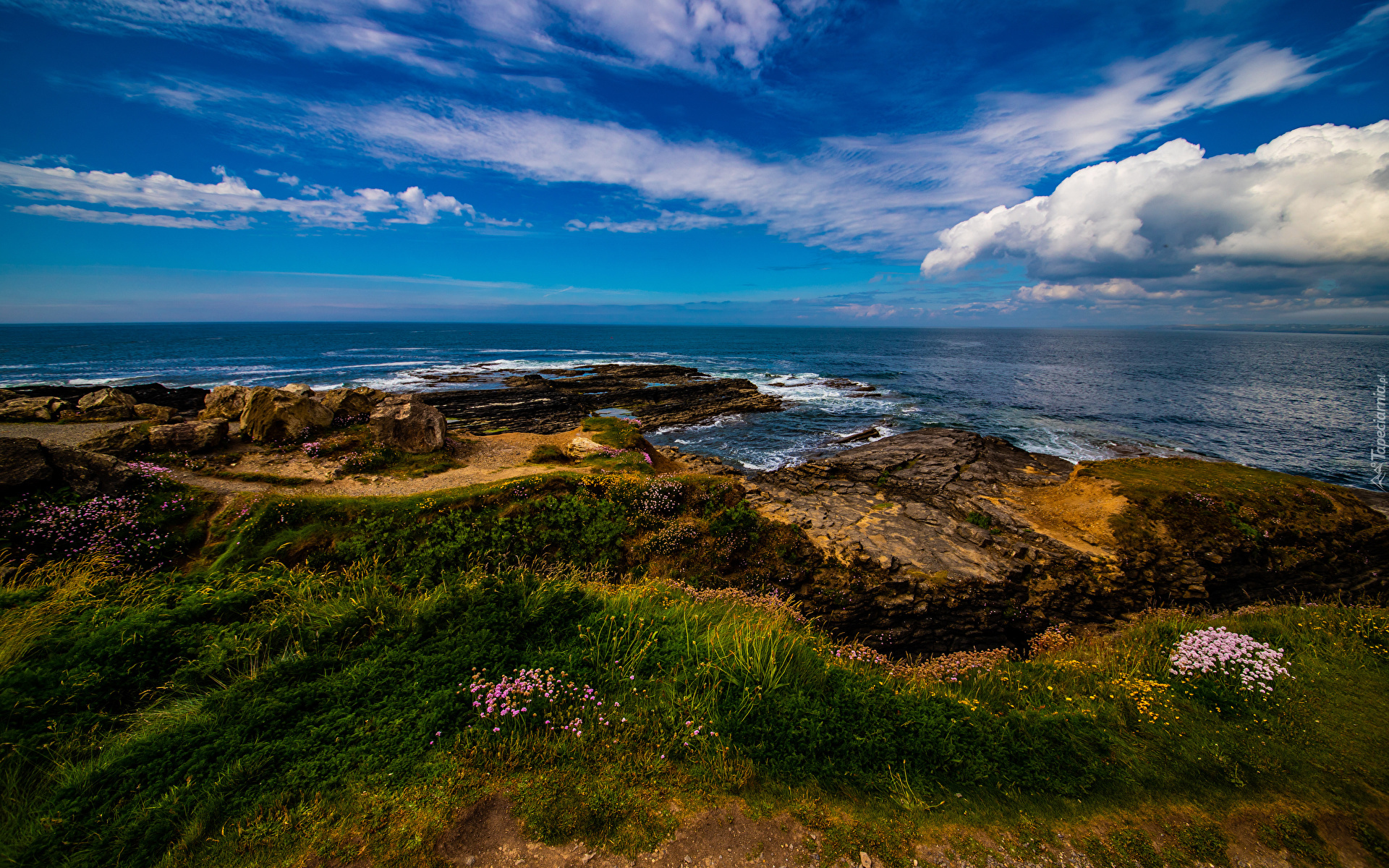 Edytor tapety: Skały i kwiaty na wybrzeżu morza