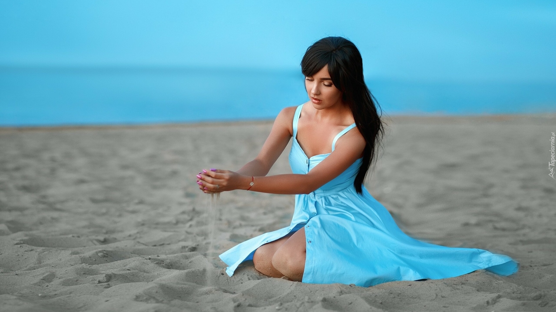 Edytor tapety: Dziewczyna w niebieskiej sukience siedząca na plaży