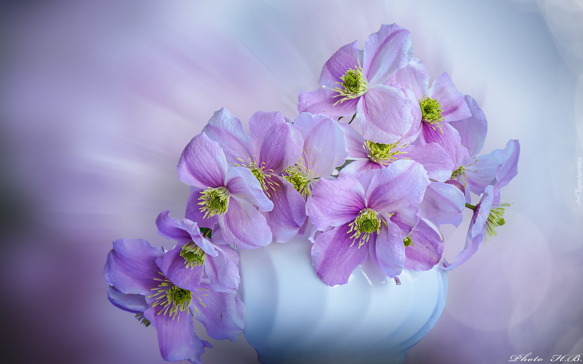 Edytor tapety: Fioletowe powojniki w wazonie