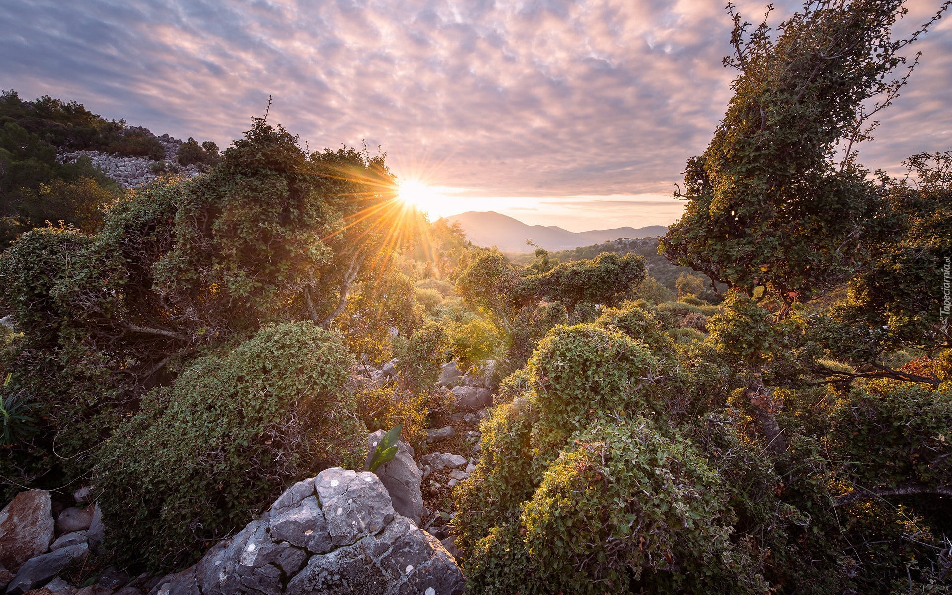 Edytor tapety: Drzewa i rośliny na kamieniach w promieniach słońca