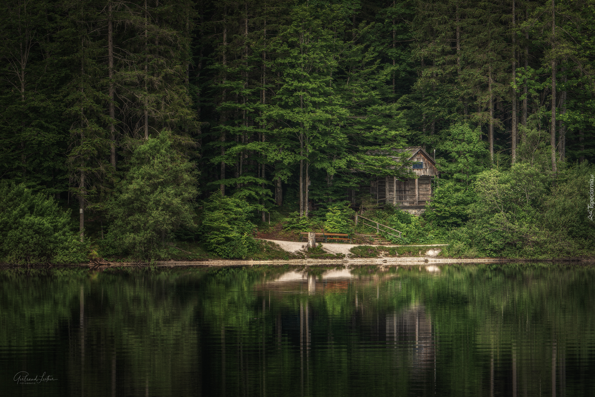 Edytor tapety: Domek w lesie iglastym nad jeziorem