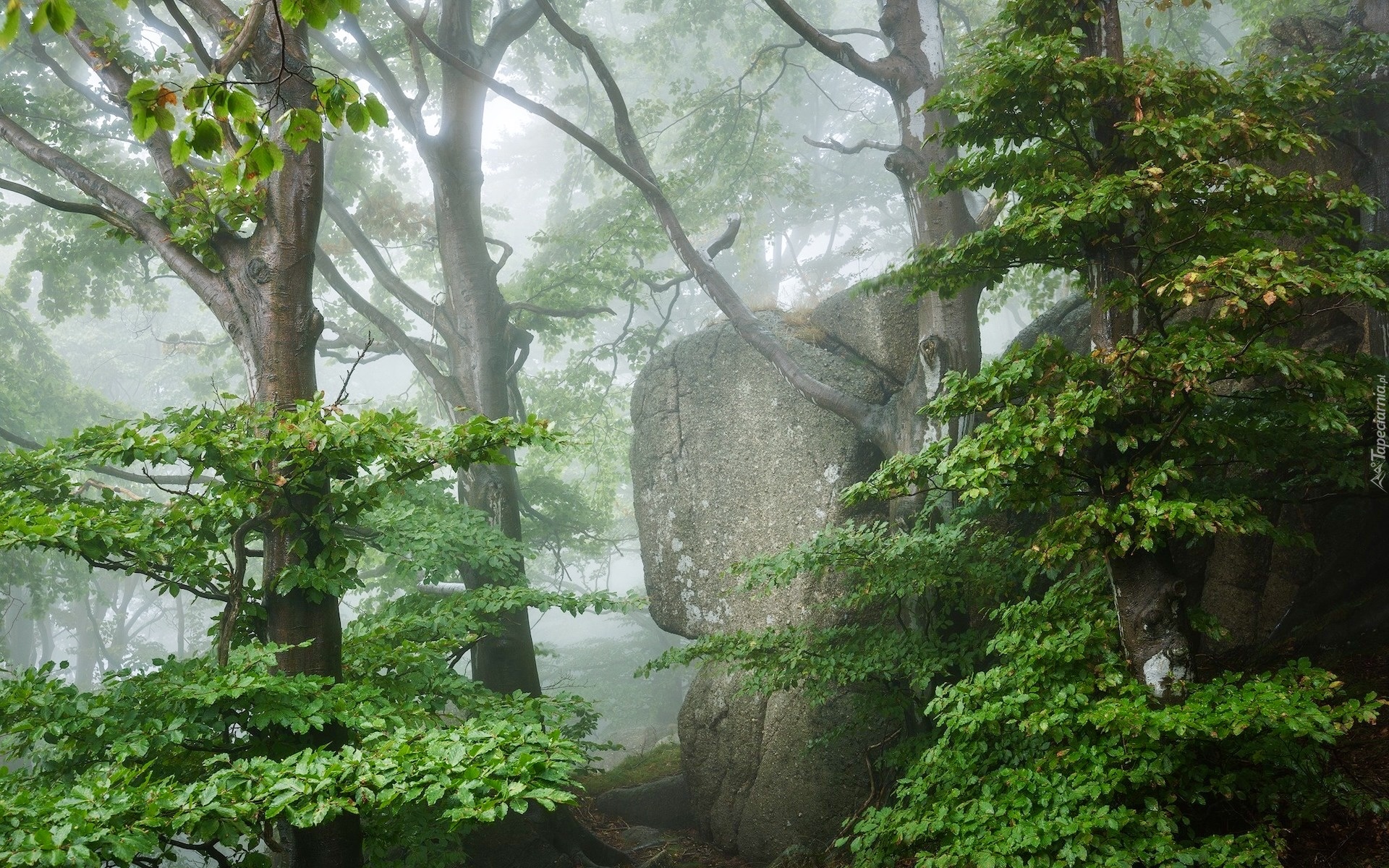 Edytor tapety: Drzewa obok skały w zamglonym lesie