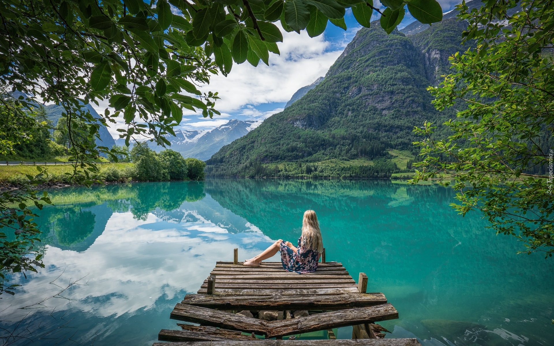 Edytor tapety: Kobieta na zniszczonym pomoście nad górskim jeziorem